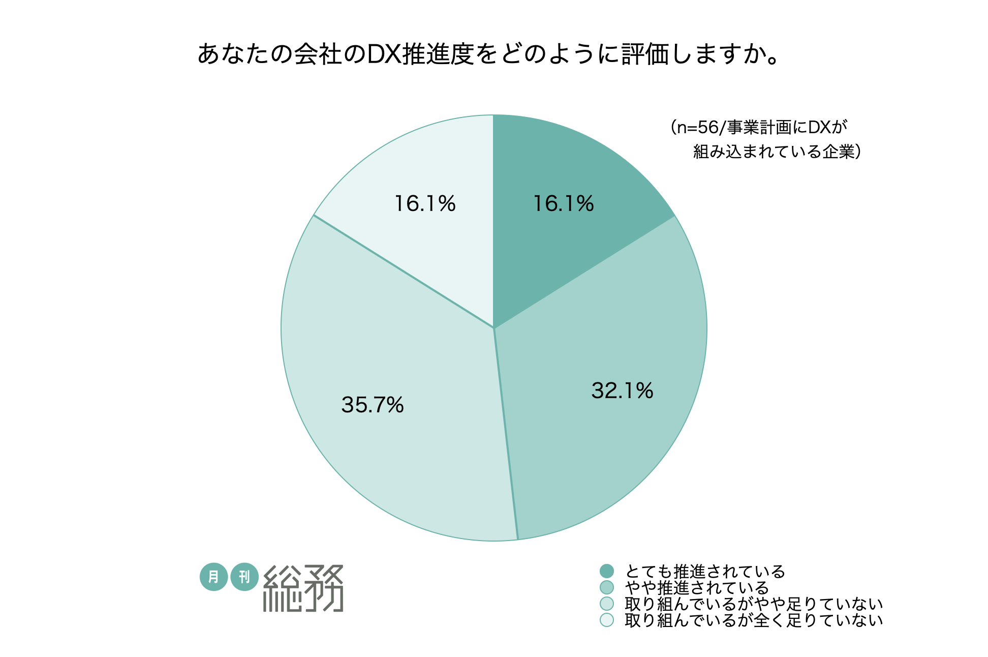 - 半数以上が会社のDX推進の取り組みは「足りていない」と評価