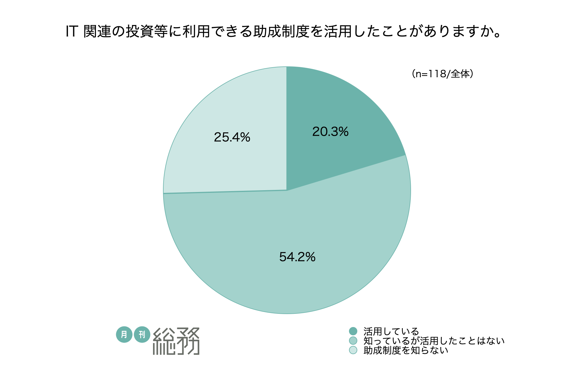 - IT 関連の投資等に利用できる助成制度は半数以上が「知っているが活用したことはない」