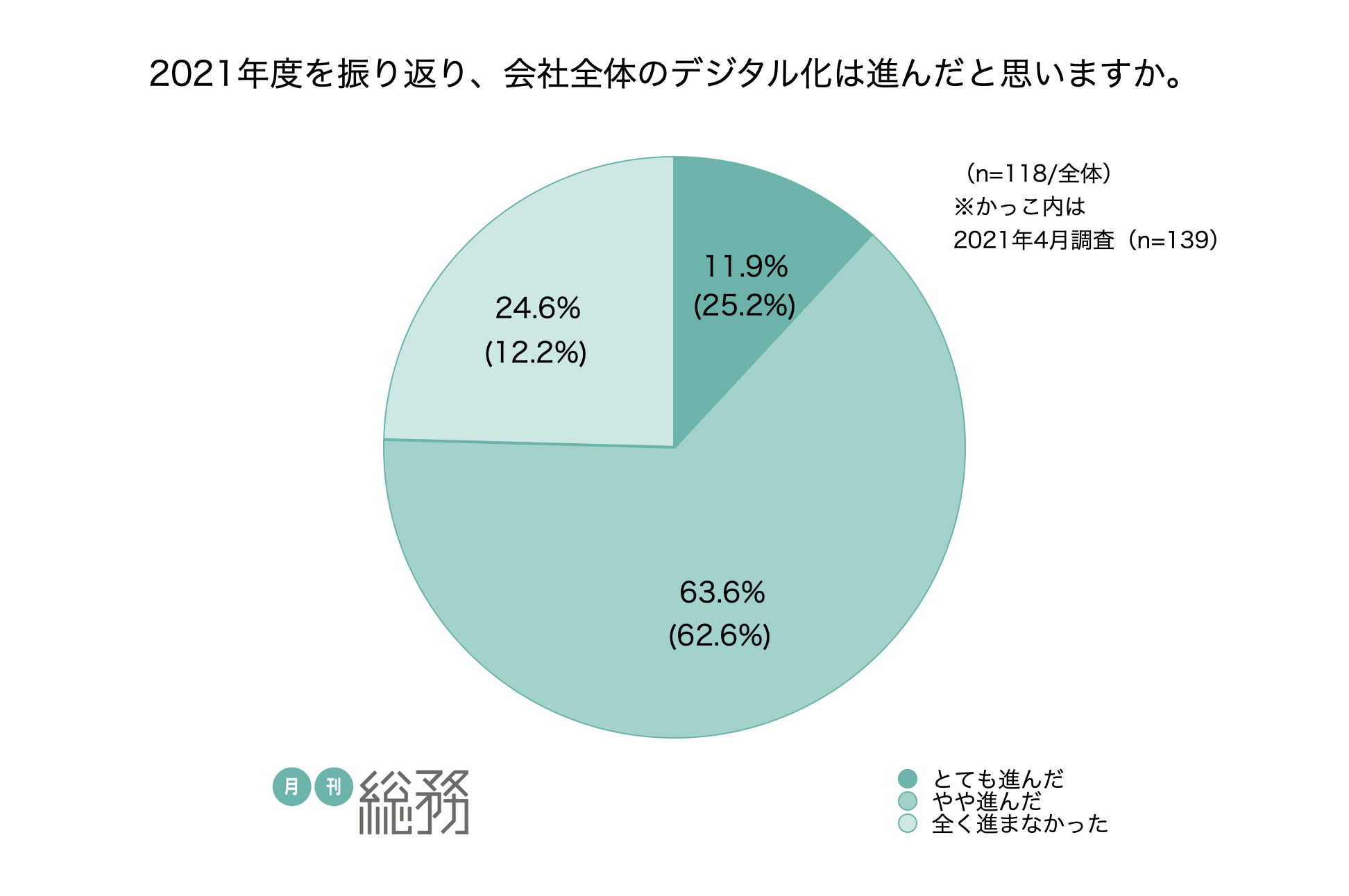 - 2021年度に会社全体のデジタル化が進んだ企業は75.5%で2020年度より12.3ポイント減