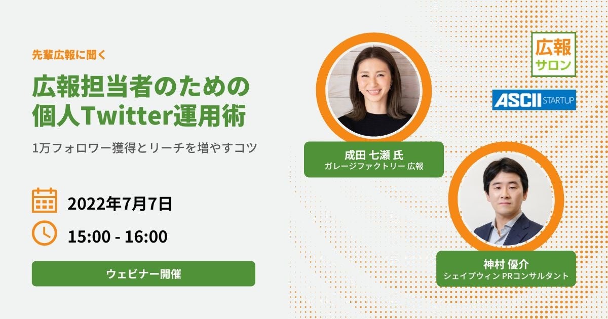 今回は、ガレージファクトリーに1人目の従業員として入社され、Twitterを武器に広報活動を展開する成田七瀬さんをゲストに広報担当者のための"個人"Twitter運用のノウハウを伺います。成田さんは、2020年から広報としての個人アカウントを開設し、たった1年足らずで1万フォロワーを達成しています。