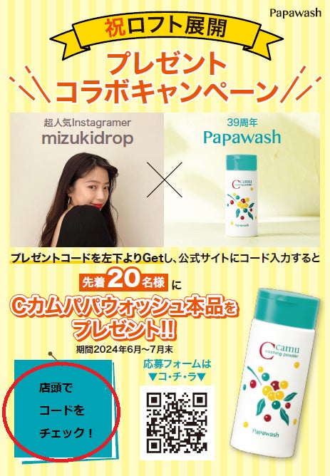 6月12日(水)より、全国20店舗のロフトにて夏季限定版「Cカムパパウォッシュ」の取り扱いがスタート。初展開を記念して人気インスタグラマーmizukidropさんとコラボした店頭キャンペーンを実施し、先着20名様にCカムパパウォッシュ本品をプレゼントいたします。