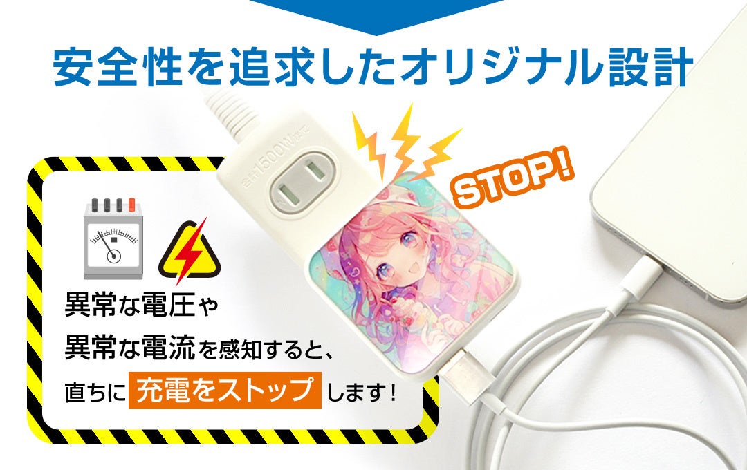また、USB-ACアダプター本体には強靭で燃えにくいPC(ポリカーボネイト)を採用。見た目だけでなく、機能性・安全性にも配慮したオリジナルグッズとして、法人・団体様の物販・ノベルティ用途に安心してご活用いただけます。