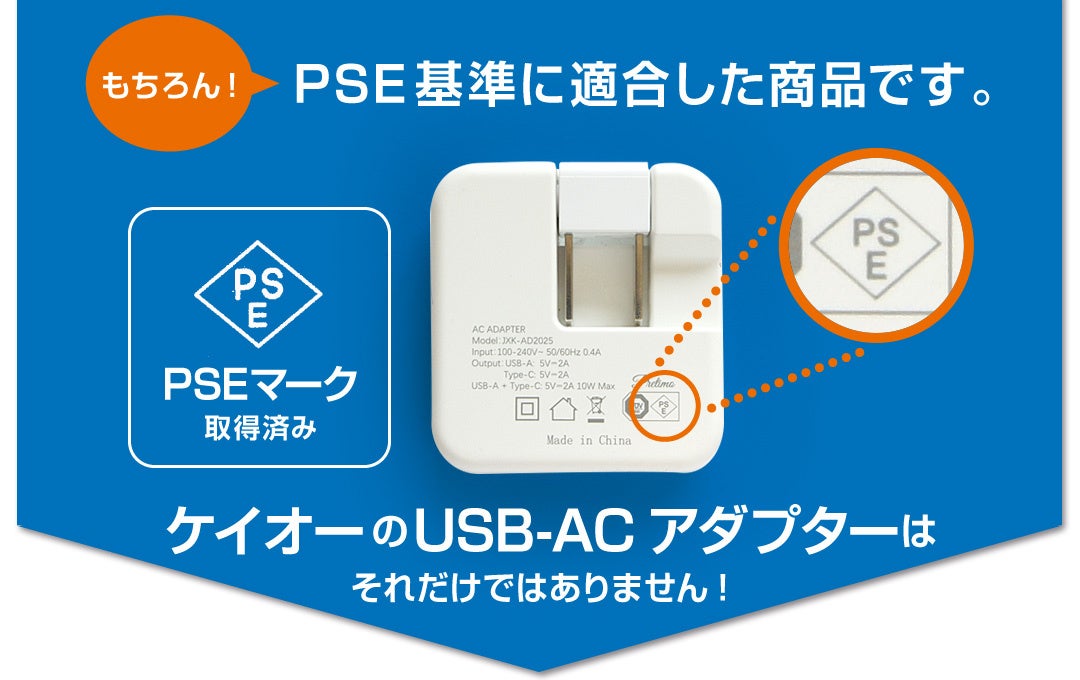 ケイオーのオリジナル USB-ACアダプターは、PSE(電気用品安全法)特定電気用品の安全基準に適合しているのはもちろんのこと、さらなる安全性を追求した独自設計で、安心してお使いいただける高品質を実現しました!