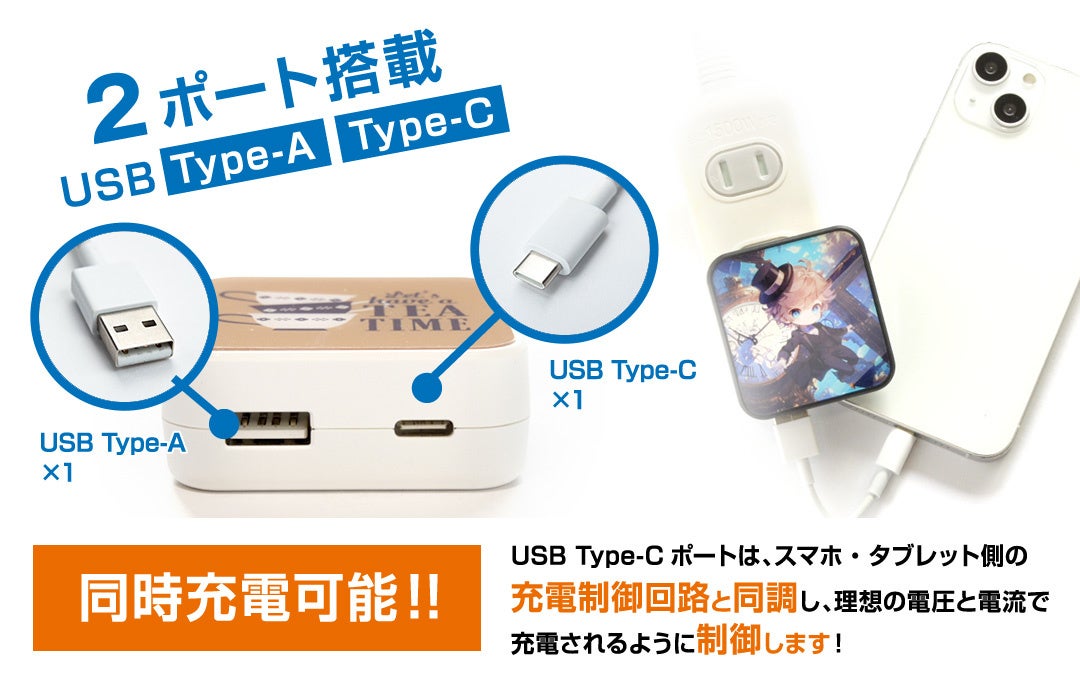 ケイオーのオリジナル USB-ACアダプターは、Type-AポートとType-Cポートの2ポートを搭載しており、スマートフォンとタブレットなどの複数デバイスを同時に充電できます。