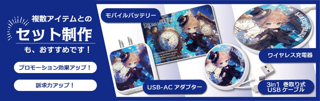 関連アイテムとのセット制作もおすすめです!セットで販売することで、お客様の購買意欲を掻き立て、より訴求力とプロモーション力のあるグッズとして展開いただけます 。