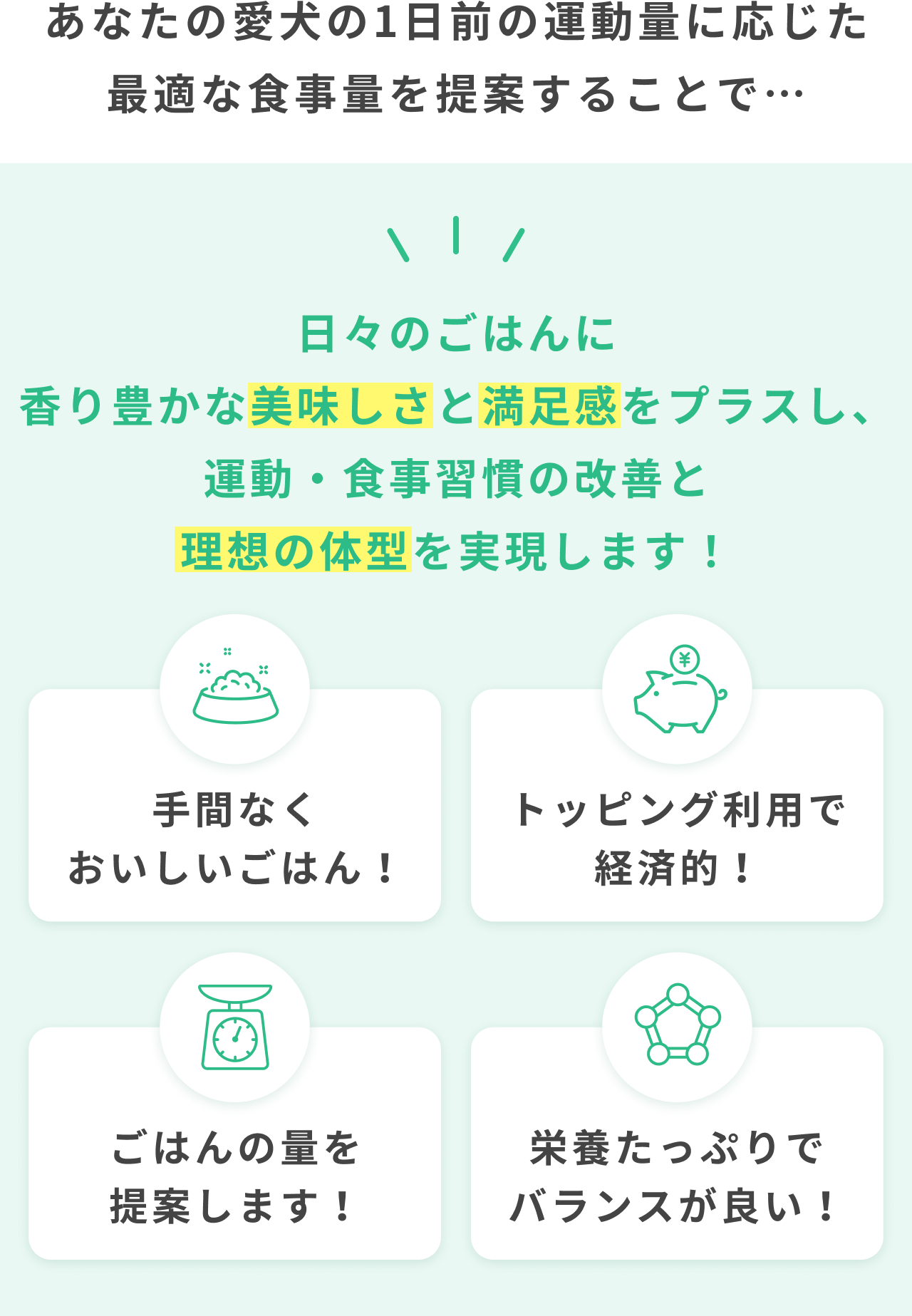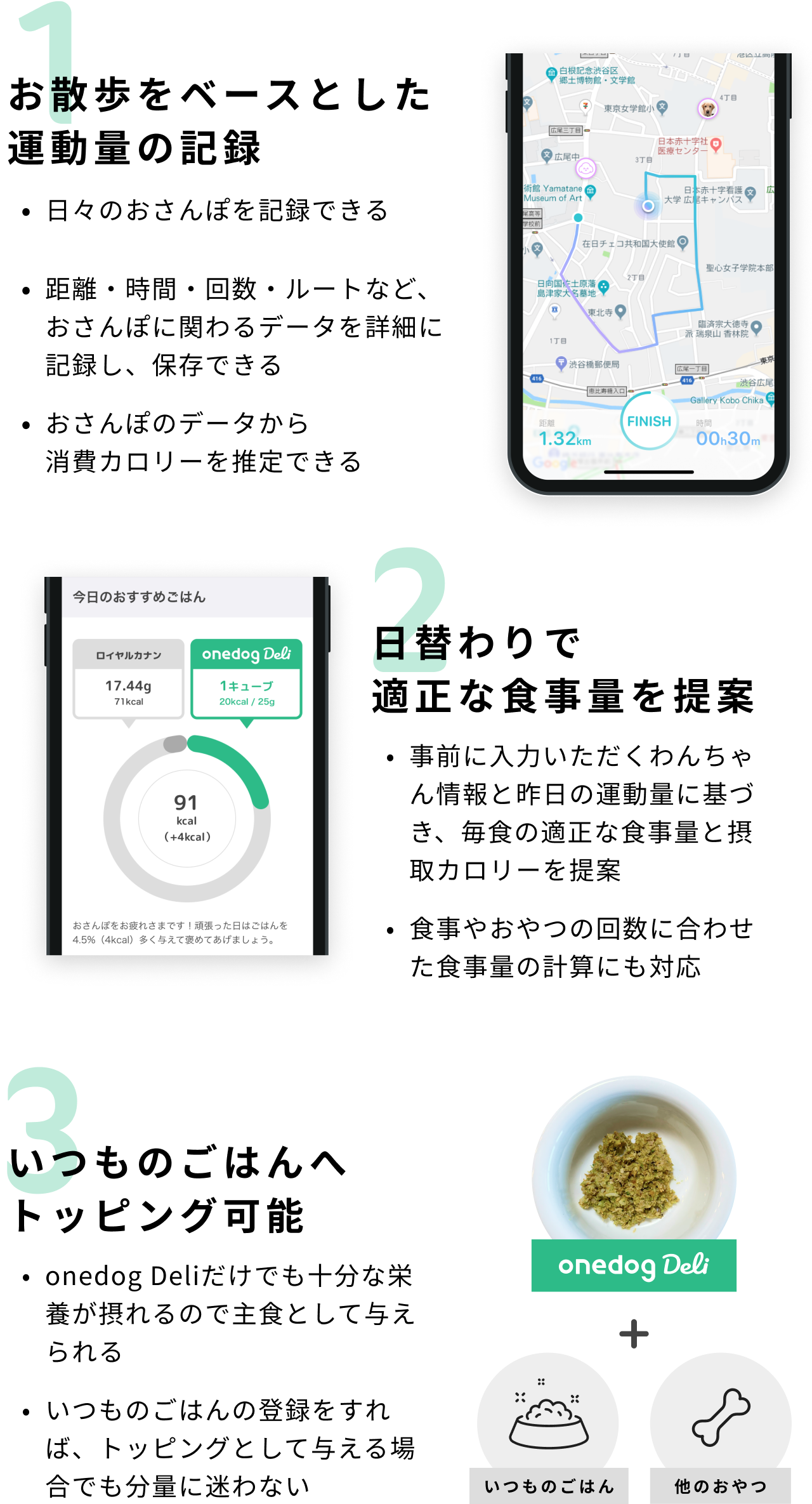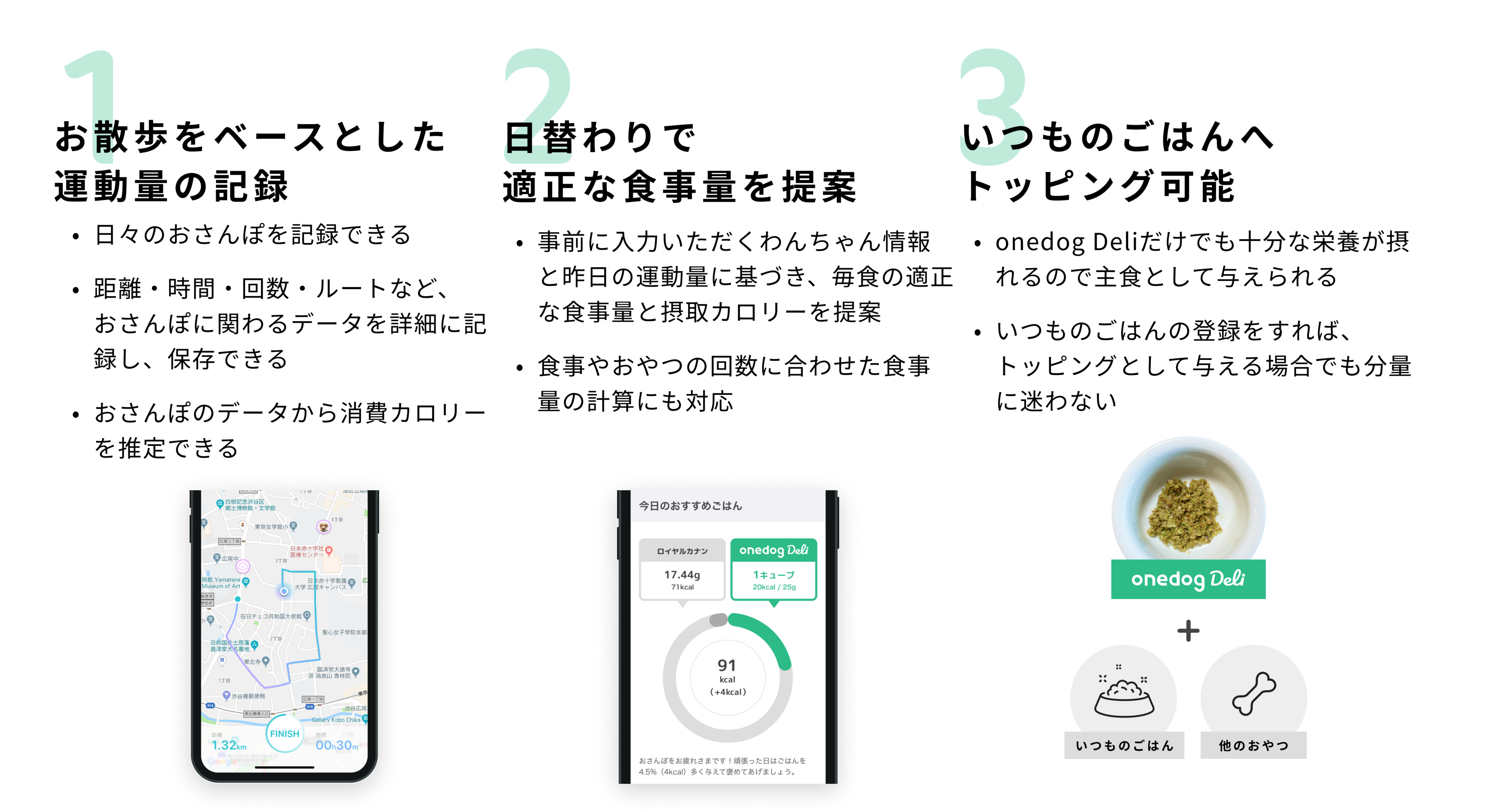 アプリでお散歩をベースとした運動量を記録すると、お散歩データから消費カロリーを推定し、日替わりで適正な食事量をアプリからレコメンドが受け取ることができます。