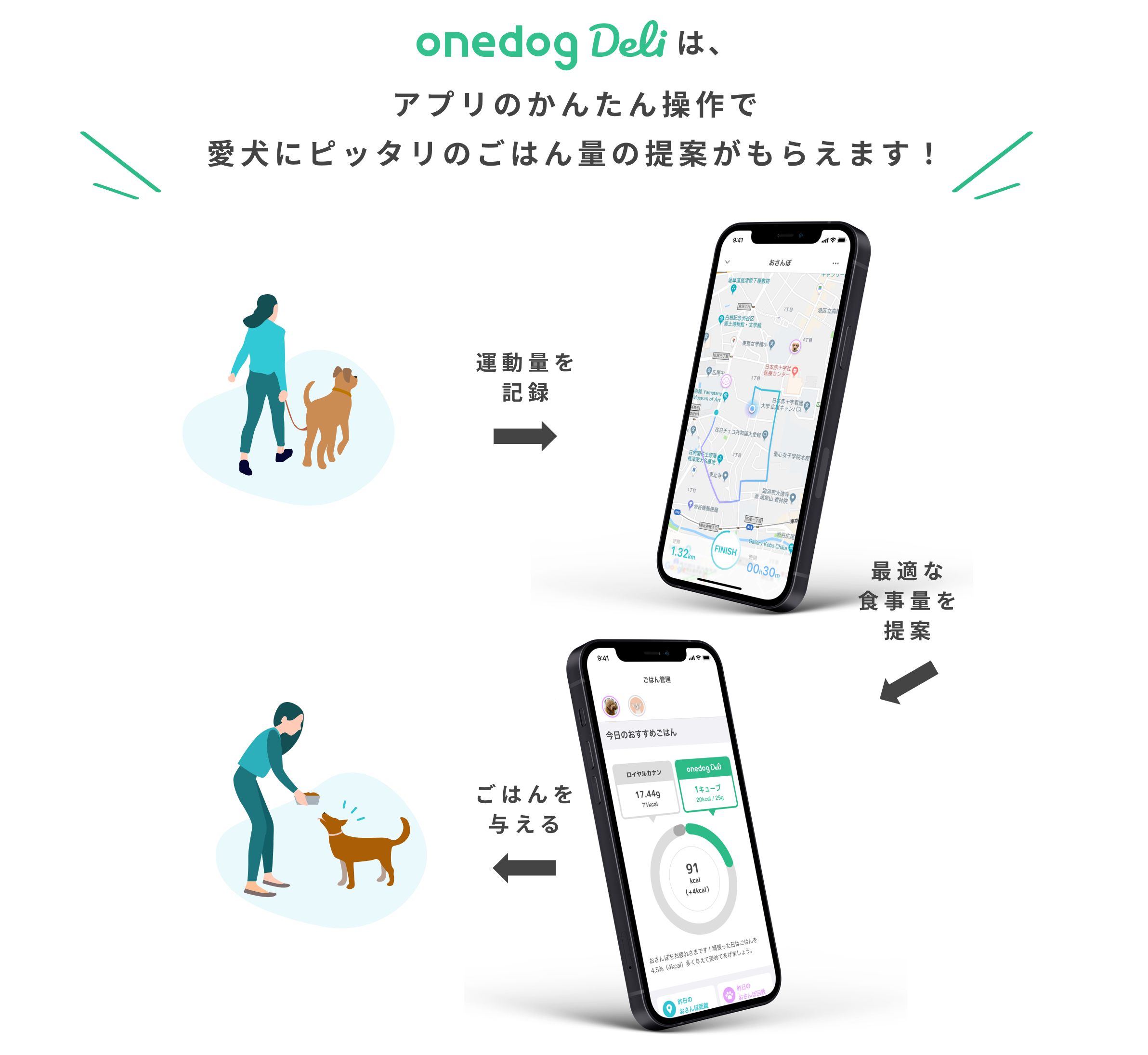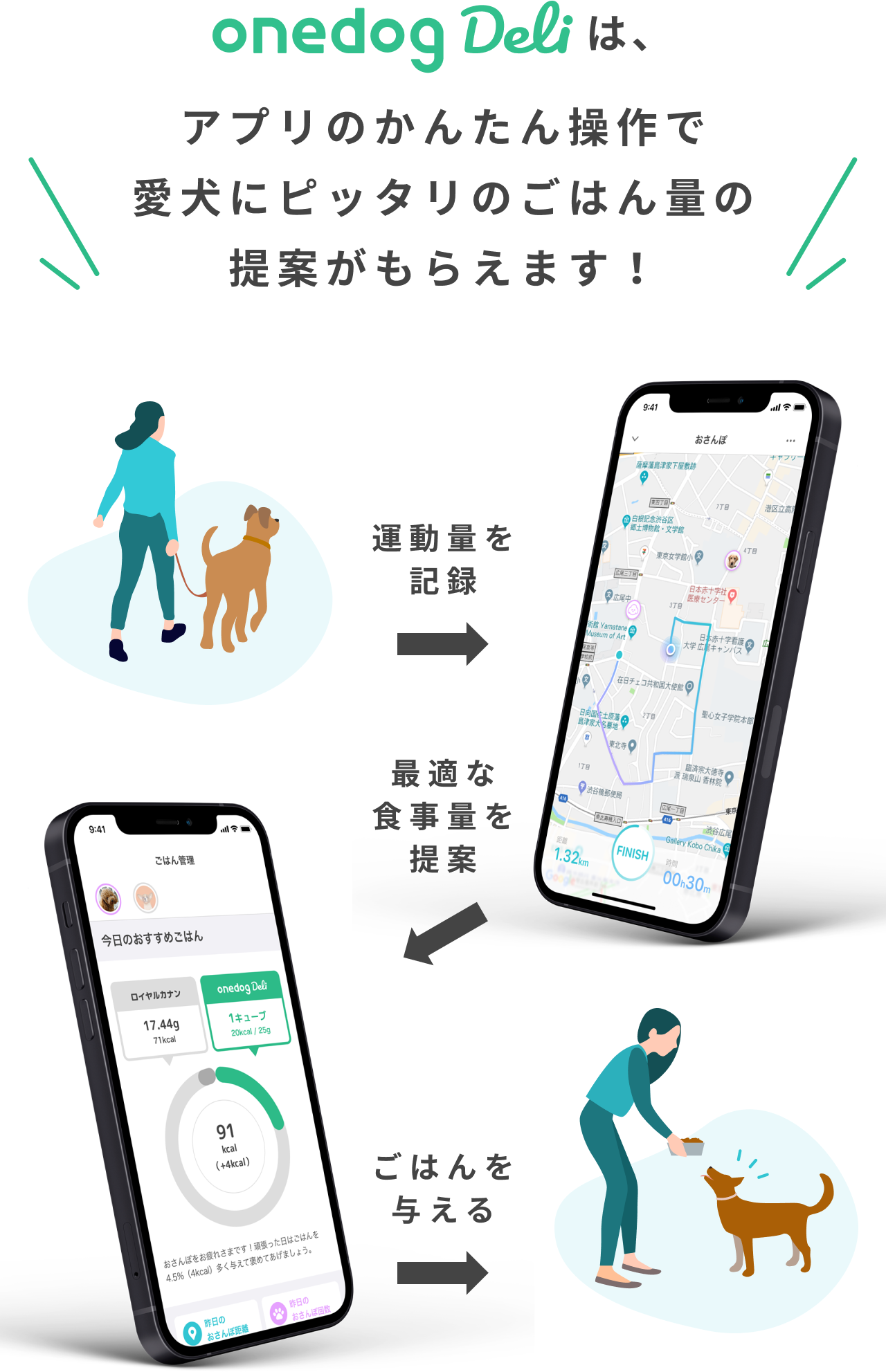 onedog Deli では、毎日同じ食事量ではなく、日々の運動量と食事量を管理することで、愛犬の健康をサポートすべくアプリのかんたん操作で愛犬にピッタリのごはんの量の提案いたします。
