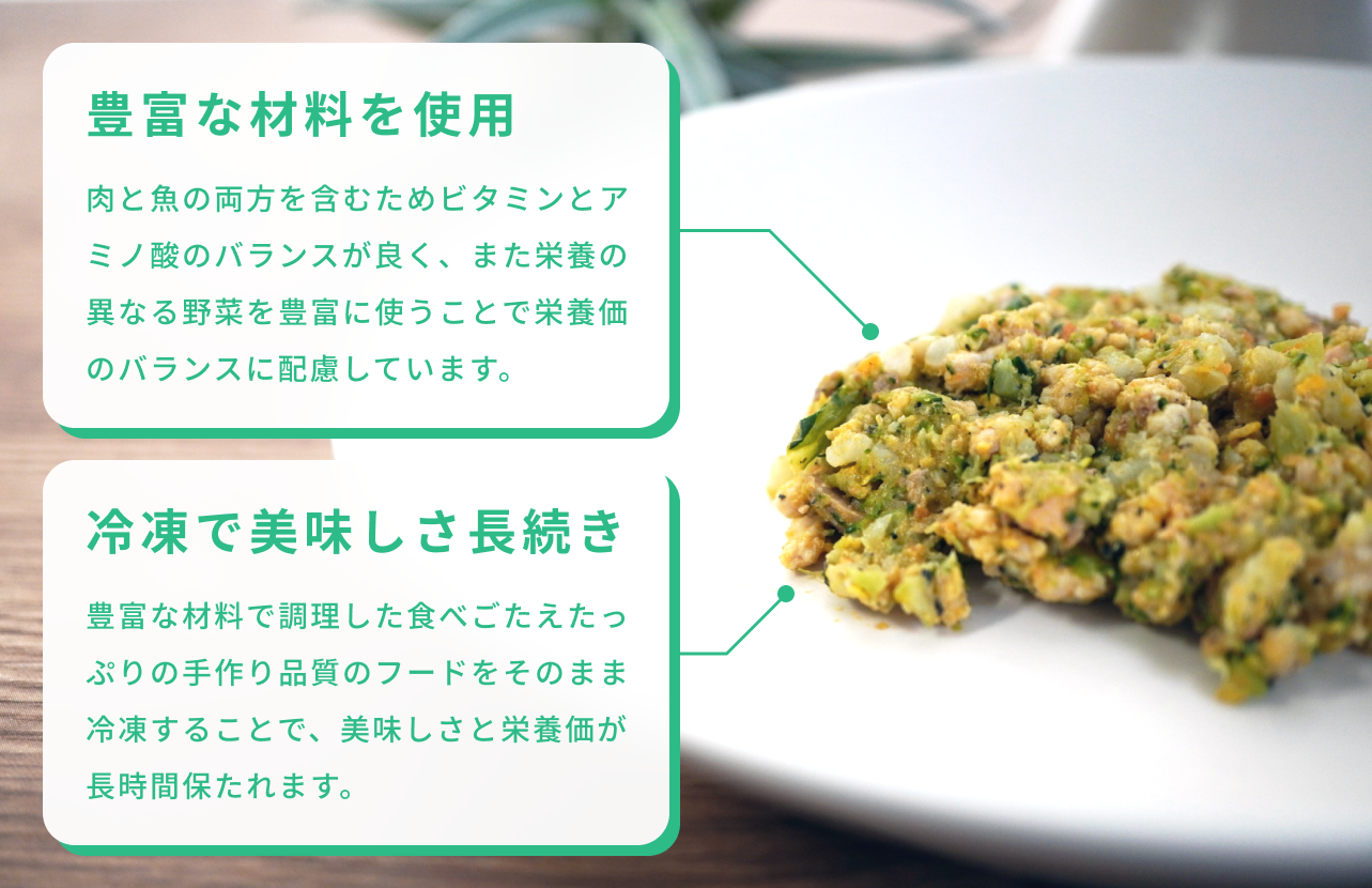 ・製造後すぐに冷凍するため、素材の味を楽しめる手作りごはんのような美味しさを実現