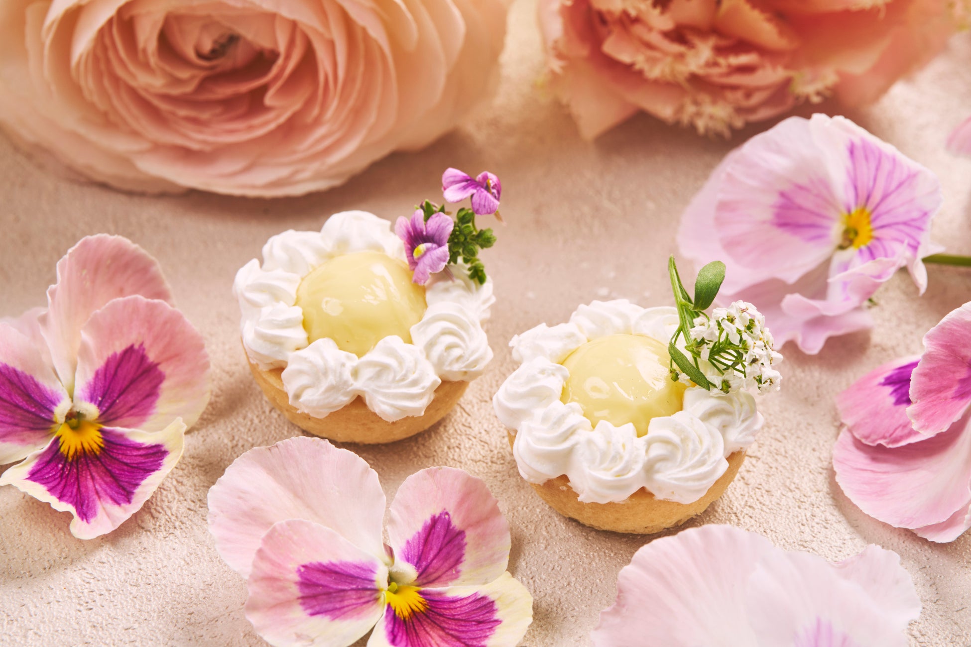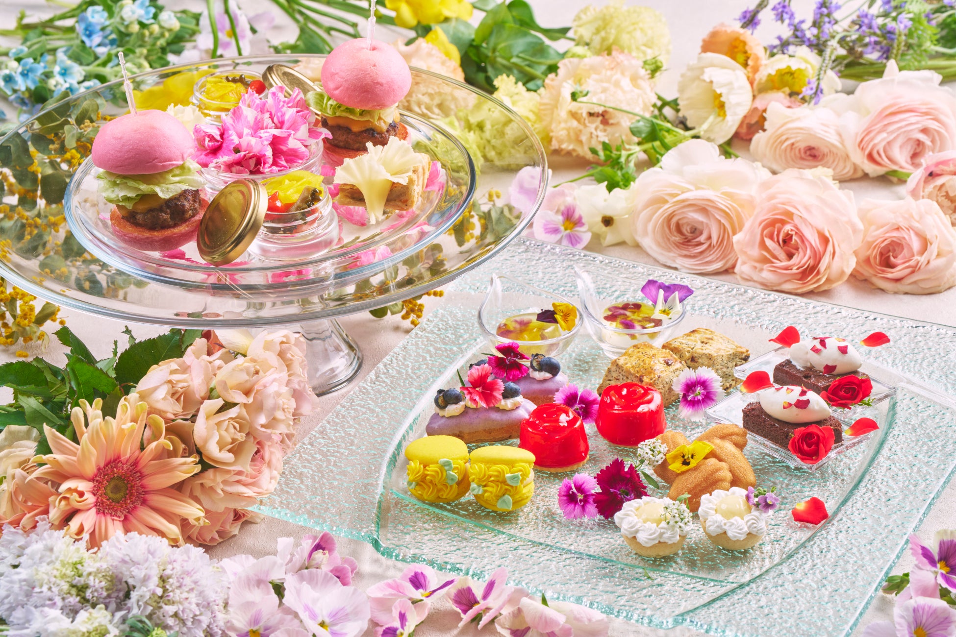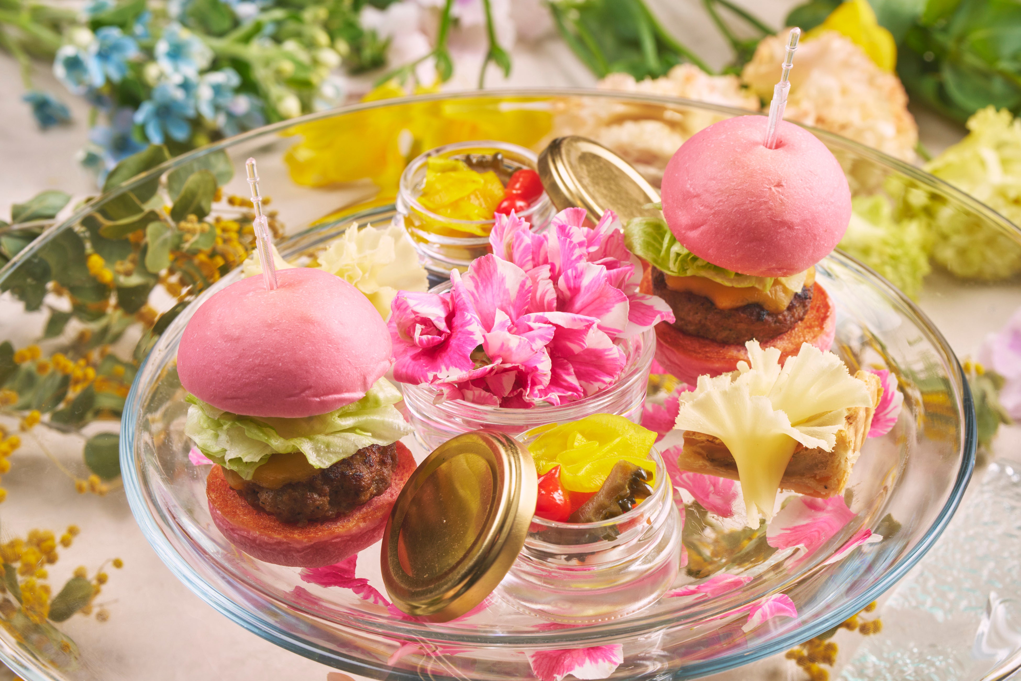 エディブルフラワーをあしらった色とりどりのスイーツは、口に含むとほんのりと花の香りが広がります。鮮やかな赤でバラを表現した「レモンdeレアチーズ」や、爽やかな風味が特徴の「シークワサータルト」など、全8種類のスイーツを取り揃えました。また、桜をイメージしたピンクのバンズが華やかな「桜バーガー」を含む、4種類のセイボリーもご堪能いただけます。料金はお一人様3,800円で、コーヒーまたは紅茶が付き、火曜日から金曜日までの限定開催となります。また、モエ・エ・シャンドンのグラス1杯が付いた贅沢なプランもご用意しており、こちらはお一人様6,000円でお楽しみいただけます。