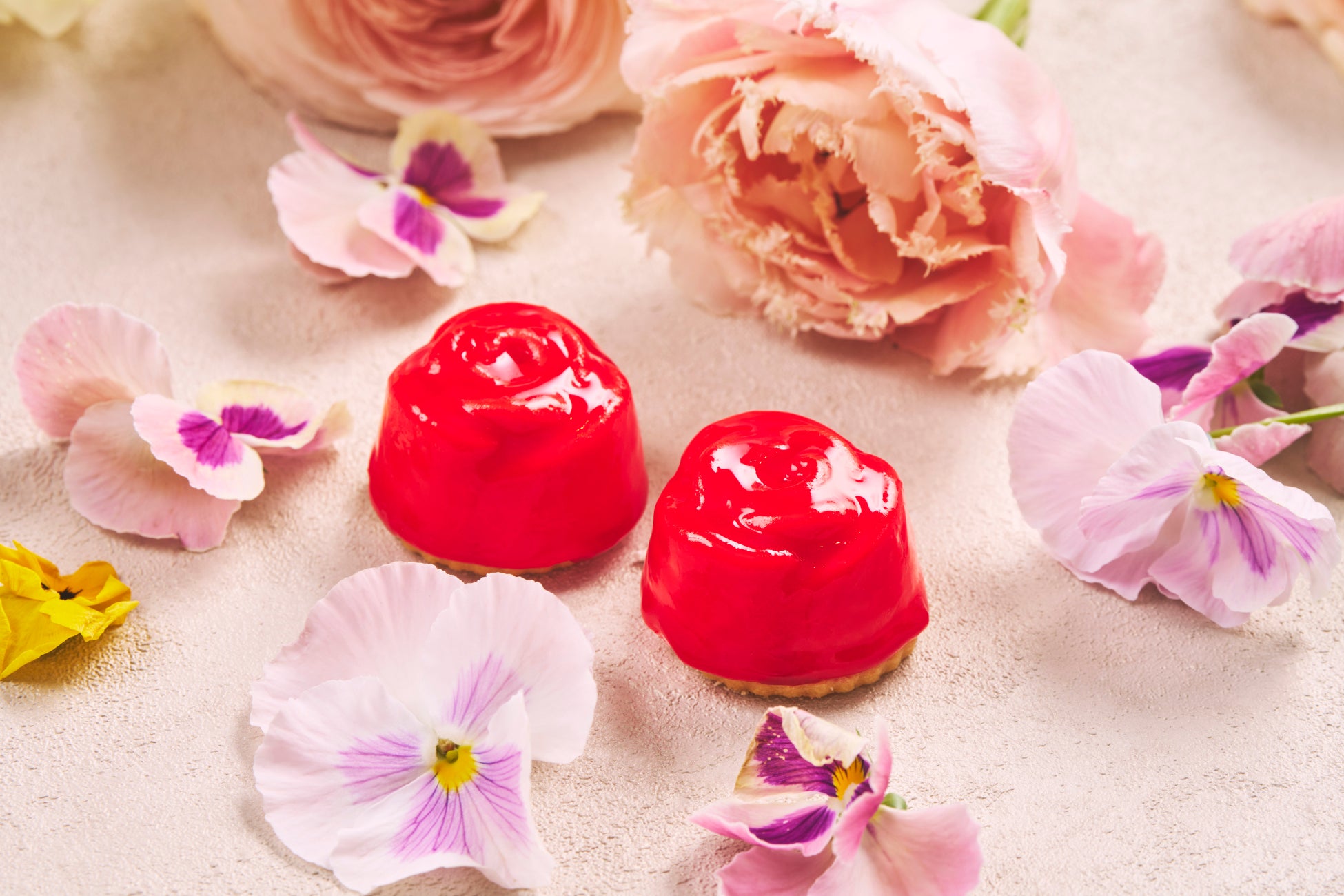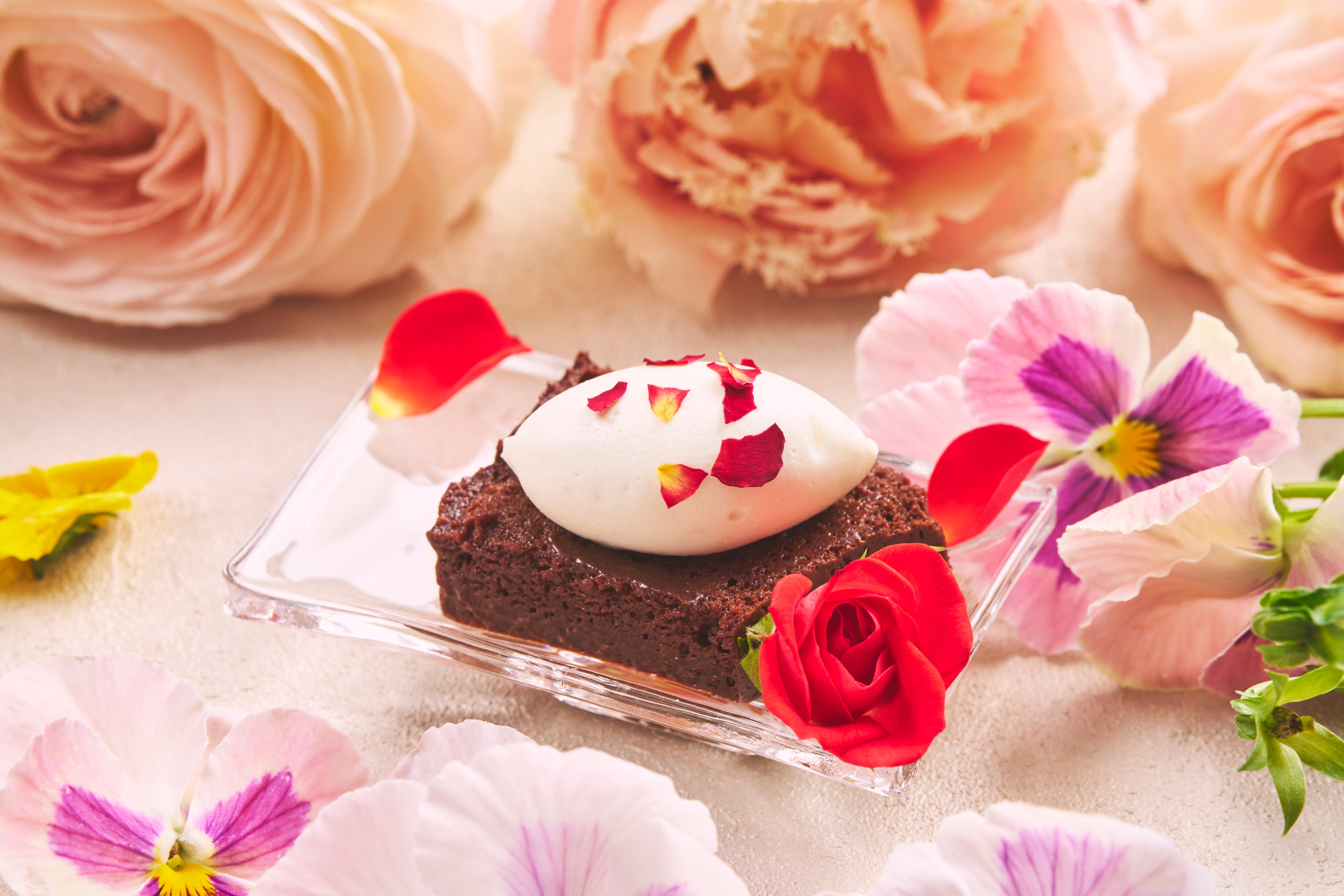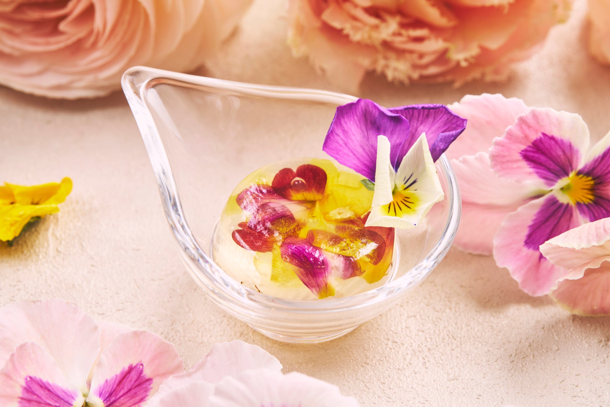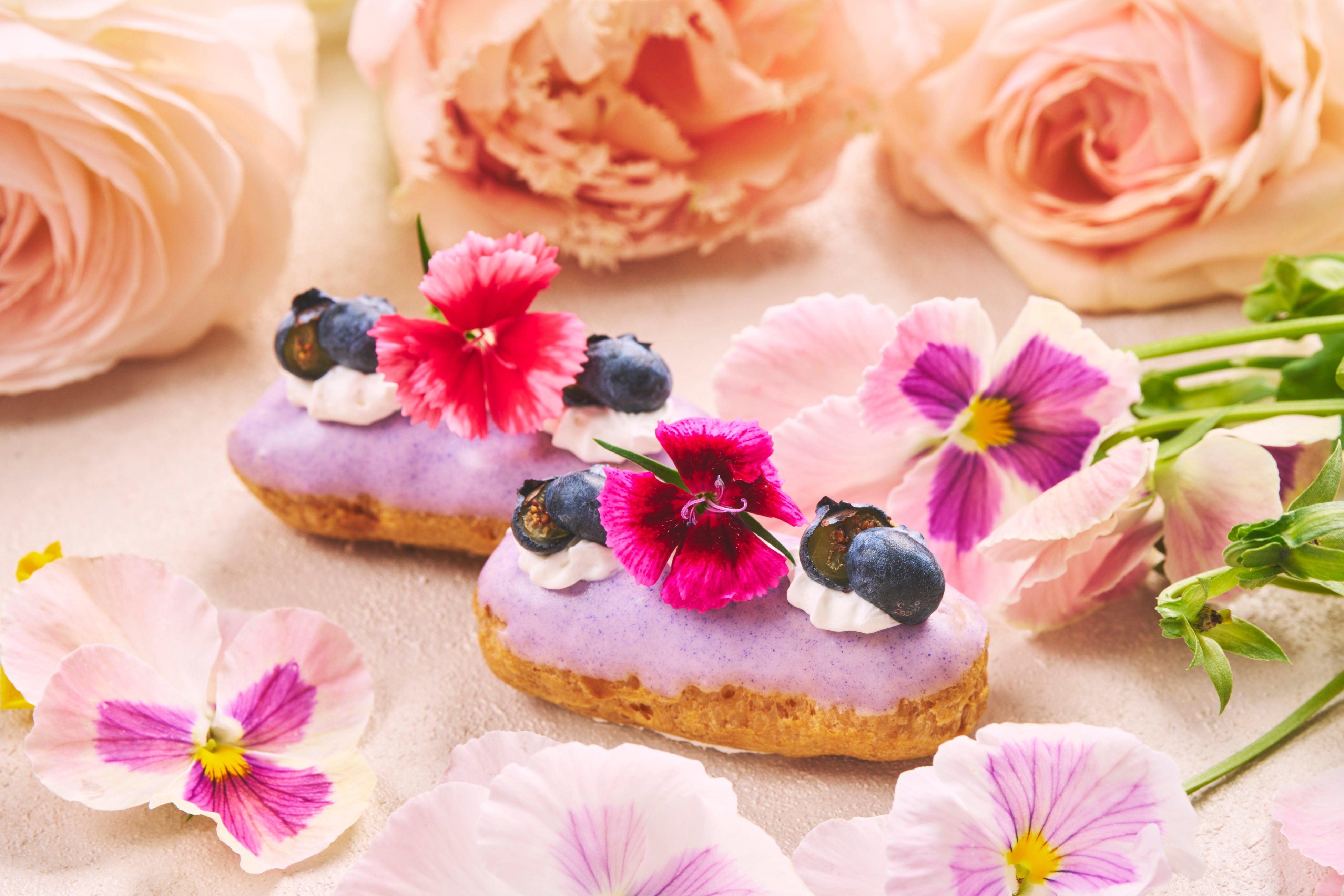 「ブルーベリーエクレア」(※3)は、ブルーベリーの甘酸っぱさと、カシスクリームの濃厚で奥深い風味が見事に調和した一品です。エクレア生地の軽やかな食感とともに、フルーツの爽やかさがクリームのコクを絶妙に引き立て、ひと口ごとに贅沢な満足感をご堪能ください。また、「エルダーシロップのフラワージュレ」(※4)は、エルダーフラワーシロップを贅沢に使用した、みずみずしく爽やかな逸品です。ほんのり甘い花の香りが広がり、透明感のあるゼリーに浮かぶ花々は、まるで静かな池に咲く幻想的な景色を思わせます。見た目の美しさと上品な味わいが織りなす、心ときめくスイーツです。