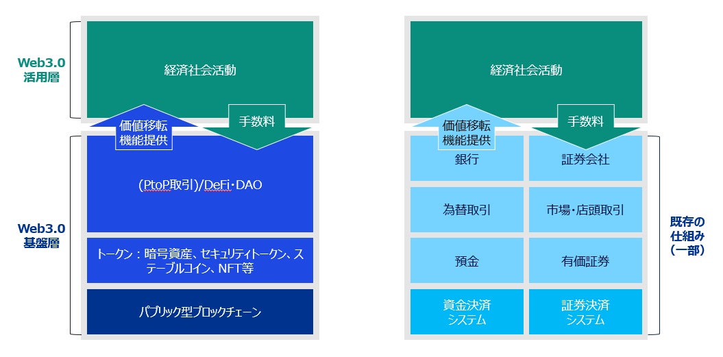 既存の資金決済や金融機関等の仕組みは業態、国別に細分化されているがWeb3.0ではグローバルで単一の基盤