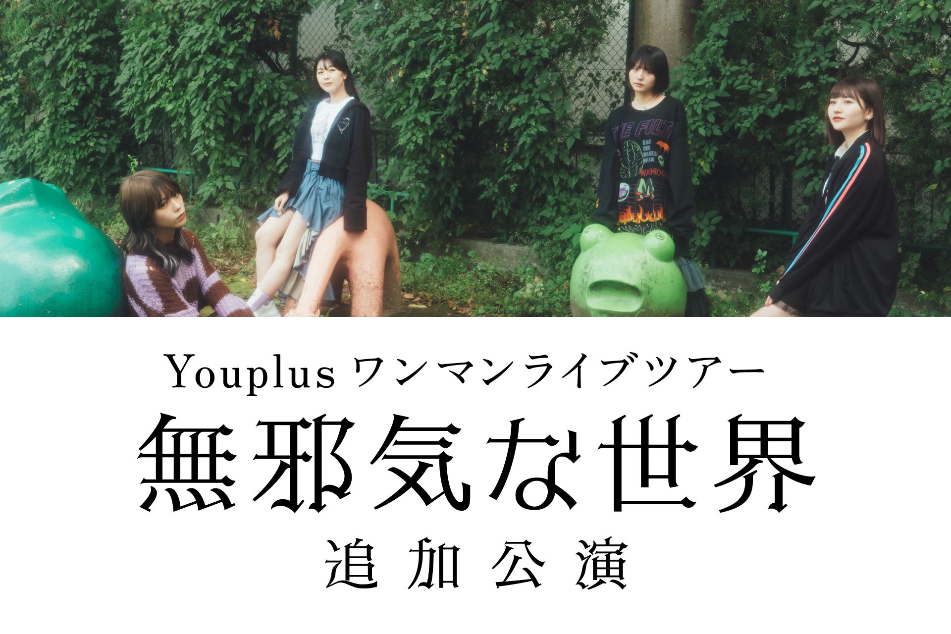 11月よりスタートした全国6都市7公演のYouplusワンマンライブツアー『無邪気な世界』。生バンドにて繰り広げられる圧倒的な世界観にリピーターが続出、ツアー中盤戦である大阪・東京はソールドアウトし再公演のリクエストが多い中遂に東阪追加公演が決定。2023年2月17日(金)大阪・梅田 Shangri-La、2月22日(水・祝前日)Shibuya Spotify O-WESTにてGrand Finalが行われる。本日、2022年12月16日(金) 20:00よりYouplus公式オンラインストアにて前売りチケット販売開始。またオリコンデイリーチャート9位を記録した2nd Single『無邪気』が『無邪気 e.p.』として2023年2月1日(水)にデジタル配信がスタート!