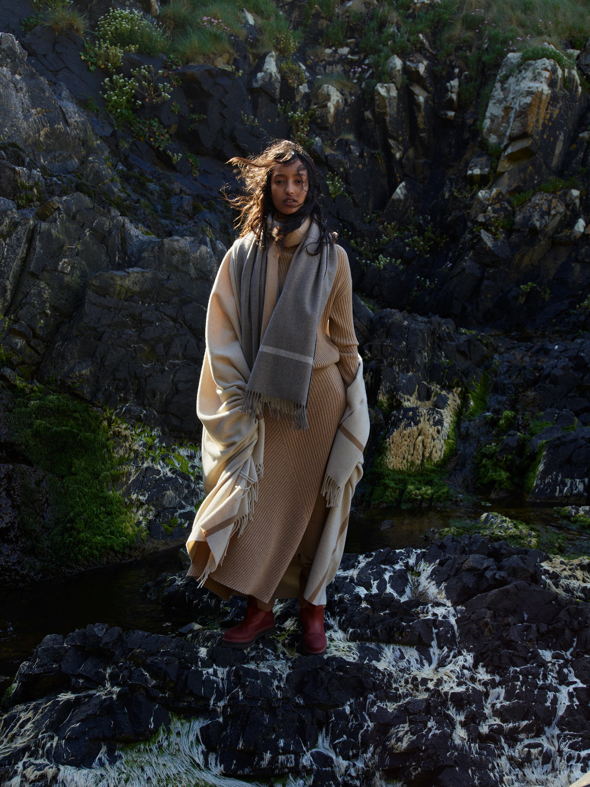 ふたつの宇宙が交わす自発的で絶え間ない対話に、ロロ・ピアーナの探検者たちはそっと足を踏み入れます。これらのイメージは、最も親密で思慮深い瞬間をとらえると同時に、自然と完全に調和するさらに自由な瞬間も見逃しません。ウェアはその地の精神、大きさ、色と結びつき――海藻と谷のグリーン、海のブルー、絶壁のホワイトとベージュ――繊細さ、力強さ、優雅さで体を包みこみます。それぞれの個性が際立ち、ロロ・ピアーナならではの軽快さを描き出しています。