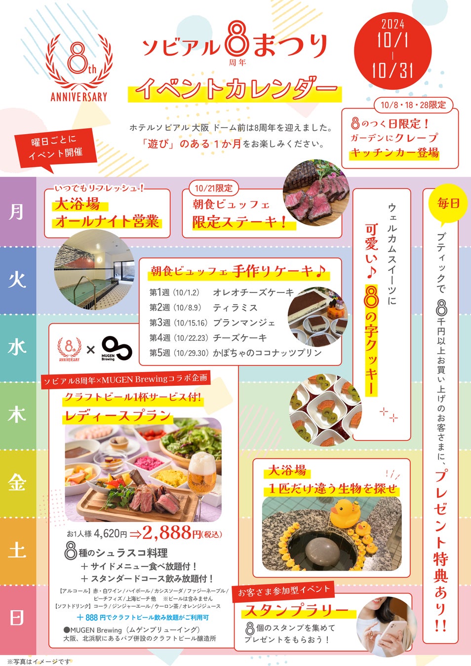 また、ホテルソビアル 大阪 ドーム前は、2024年10月21日に8周年を迎えます。皆さまへ感謝を込め、曜日ごとにイベントを開催します。お得なレストランでの特別プランやお得な宿泊プラン「ラッキー8がでたら割引」もご用意しております。「遊び」のある1か月をお楽しみください。