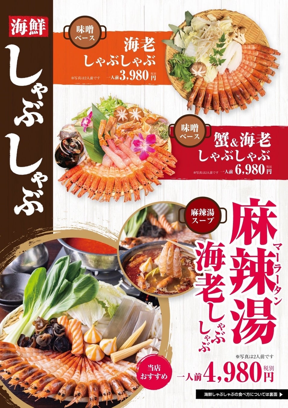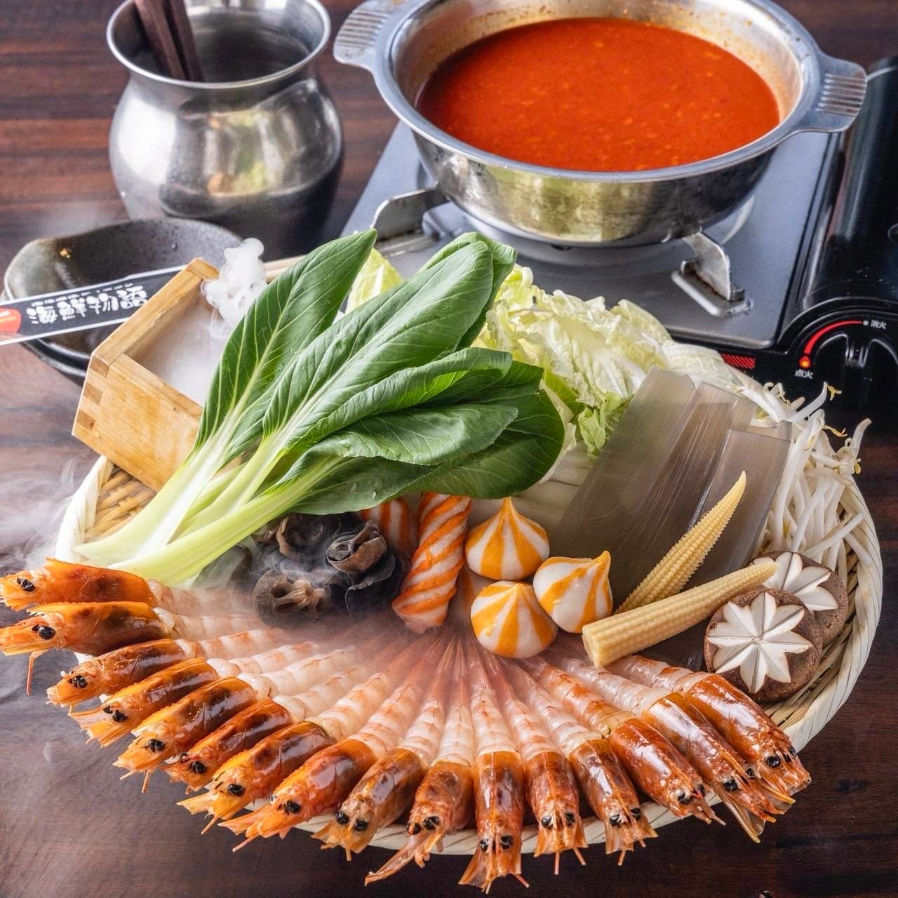 好評いただいてます味噌スープのえびしゃぶ鍋に加え、麻辣湯スープが新登場!麻辣湯で海老をしゃぶしゃぶする全く新しい方法でおいしさを再発見してください!