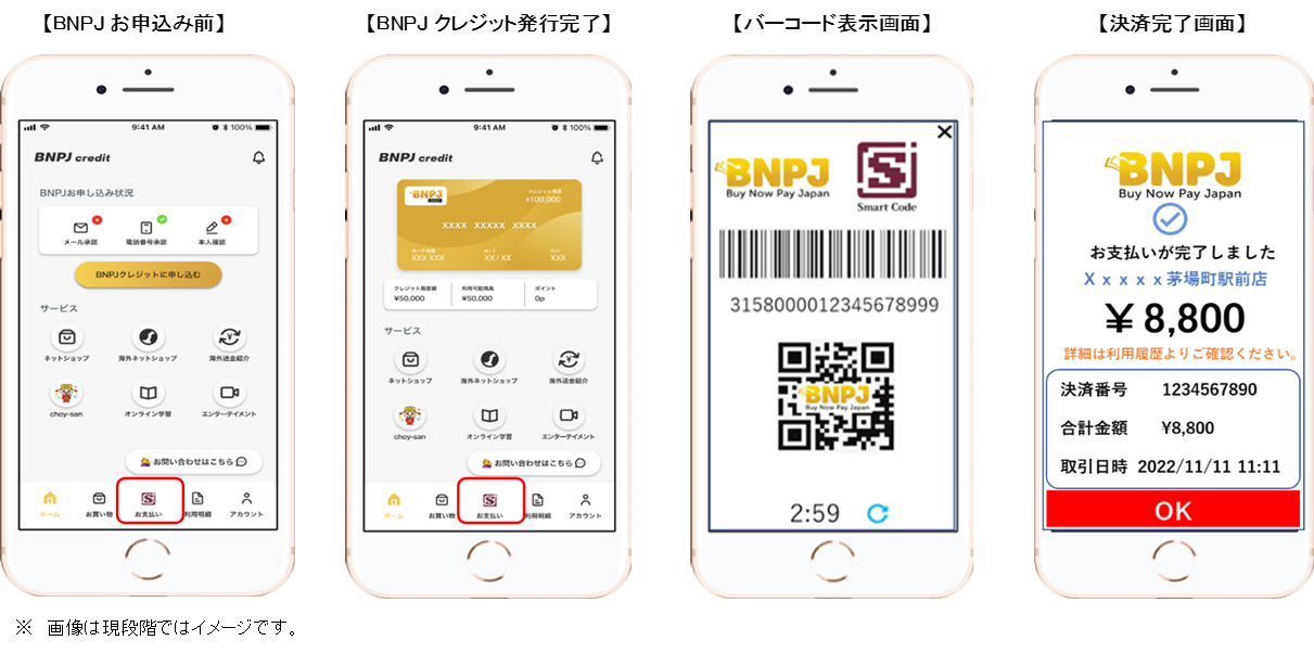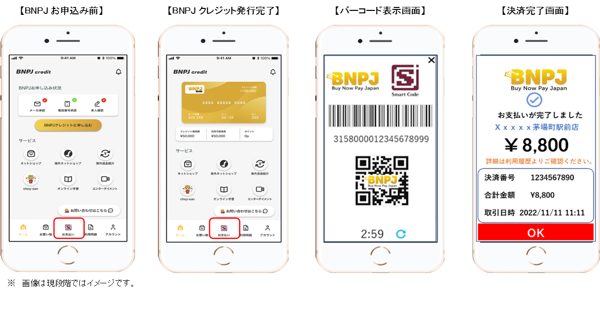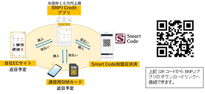 「BNPJ Credit」は、主に、日本で暮らす外国人を対象とする総合金融スマートフォンアプリです。「BNPJ Credit」アプリをスマートフォンにダウンロードし、「Smart Code」規格に準拠したQR・バーコードを表示し、「Smart Code」加盟店で決済ができます。「BNPJ Pay」を利用すれば、銀行口座や他のクレジットカードからのチャージなしに後払いができます。
