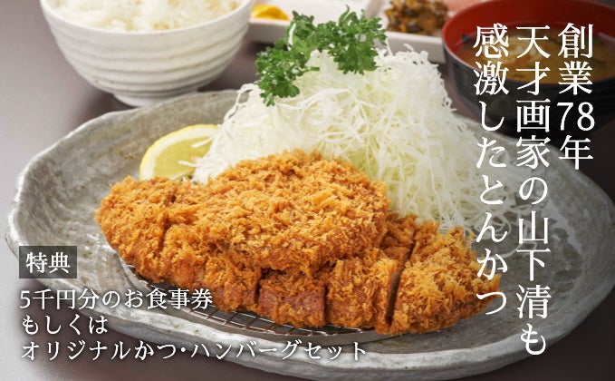 特典:1口につき、とんかつ大町のオリジナルセット(送料税込5,000円相当)または店舗で使える5,000円分のお食事券のいずれかをご希望に応じてプレゼント。