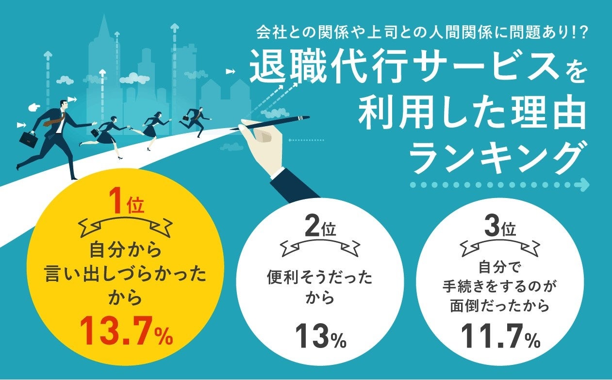 退職代行サービスを利用した300人に「退職代行サービスを利用した理由」を聞いたところ、1位は「自分から言い出しづらかったから」2位は「便利そうだったから」、3位は「自分で手続きをするのが面倒だったから」でした。