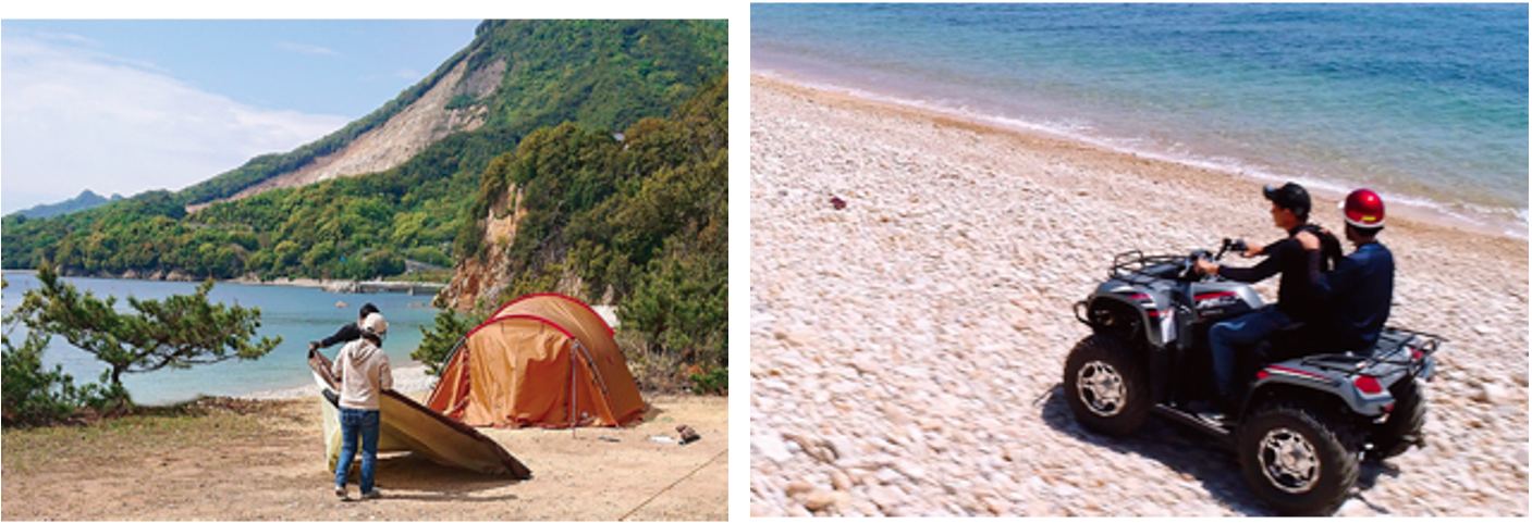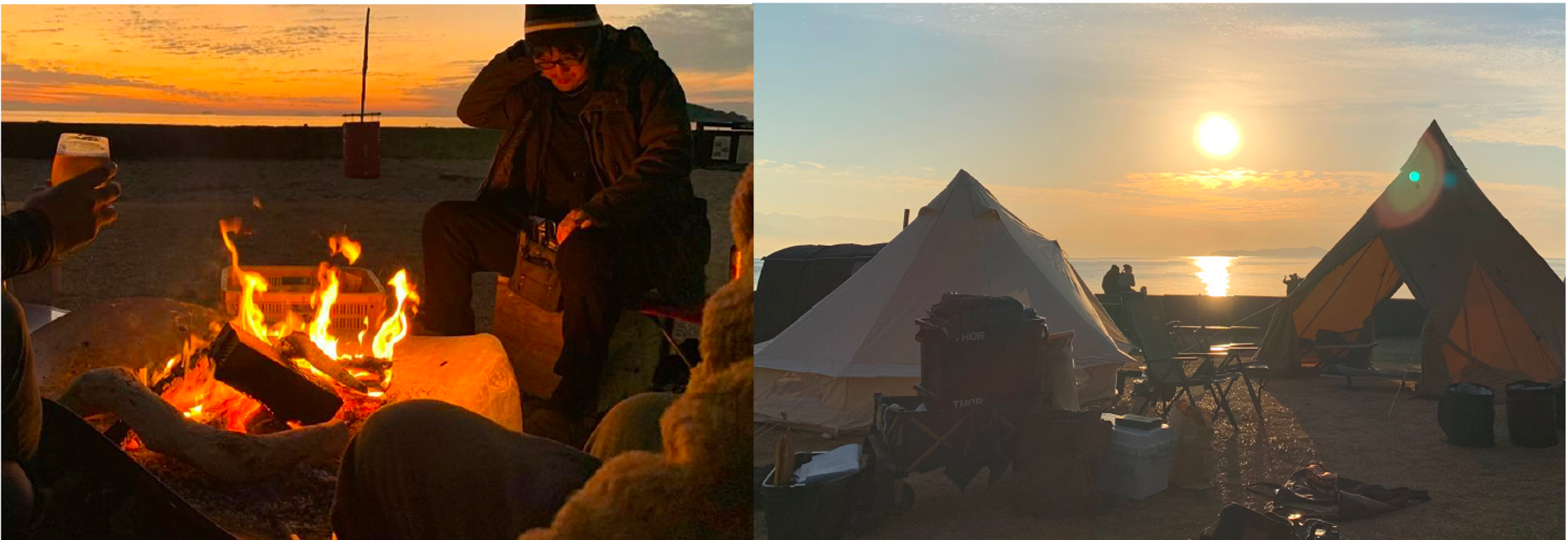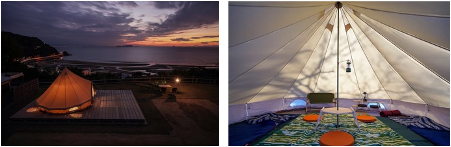 日本のウユニ塩湖として人気の「父母ヶ浜」のビーチに誕生した、1日1組限定のキャンプサイト。夕暮れの最高の時間を仲間と楽しくシェアできます。利⽤者には「⽗⺟ヶ浜ポート」で使えるドリンクチケット(1⼈1枚)がついてきます。専属カメラマンによる記念写真撮影のオプションサービスもあります。