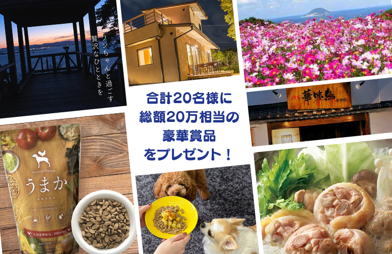 入賞者には、のこのしまアイランドパーク無料宿泊券(3万円相当)や、華味鳥店舗のお食事券(2万円分)、弊社ドッグフード「うまか」など総額20万円相当の豪華賞品を贈呈!