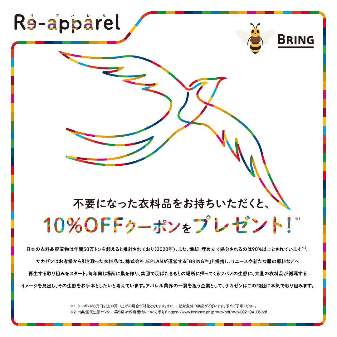 『#全ての人に楽しさと幸せを』を掲げる坂善商事株式会社(本社 東京都中央区/代表取締役社長 村上隆司)は、衣類の回収・再生・販売までを行う株式会社JEPLAN(本社 神奈川県川崎市/代表取締役執行役員社長 髙尾 正樹)が展開する「BRING」に賛同し、10月7日(金)より衣料品回収を行うプロジェクト「Re-apparel」を全国の実店舗にて開始します。回収された衣料品はBRINGによって、リユースやリサイクルにより再資源化され新たな衣料品や繊維製品、新たな資源に生まれ変わります。一部店舗と公式ECストアでは、100%再生ポリエステル素材の「BRING Material」を使用したオリジナルアイテムを販売し、期間限定で「BRING」と連携した衣料品回収プロジェクト「Re-apparel」を開催します。
