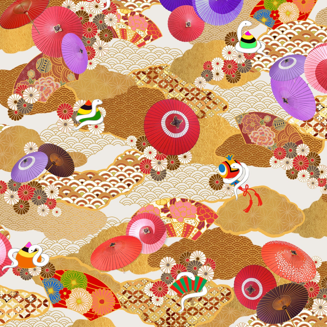 繁栄・長寿を祈念した「七宝繋ぎ(しっぽうつなぎ)、青海波(せいがいは)や末広(すえひろ)、菊(きく)、瑞雲(ずいうん)」を全体に散りばめ、色調も金運上昇を願って煌びやかに、おめでた尽くしのデザインになっています。