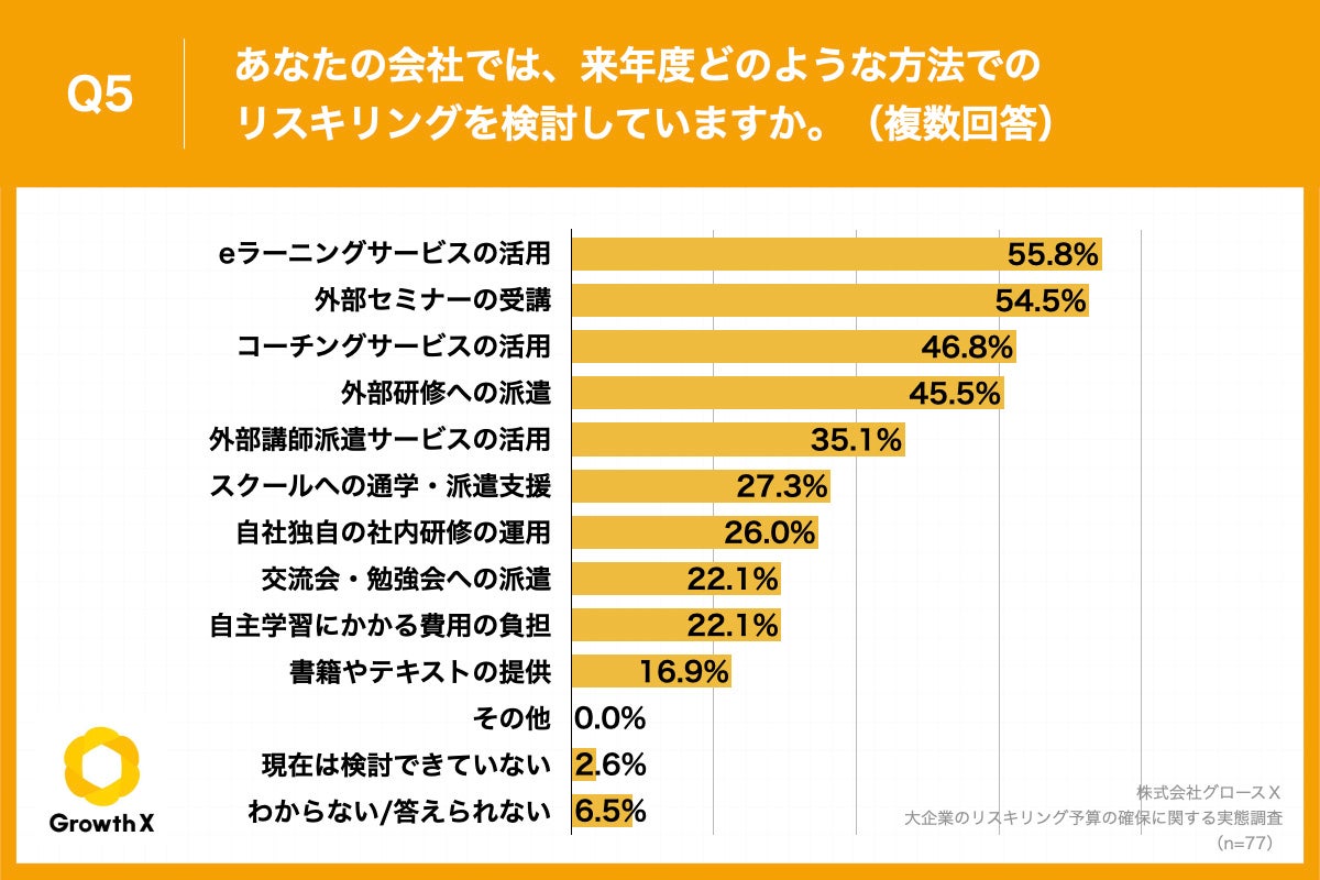 Q1で「確保している」「検討している」と回答した方に、「Q5.あなたの会社では、来年度どのような方法でのリスキリングを検討していますか。(複数回答)」 (n=77)と質問したところ、「eラーニングサービスの活用」が55.8%、「外部セミナーの受講」が54.5%、「コーチングサービスの活用」が46.8% という回答となりました。