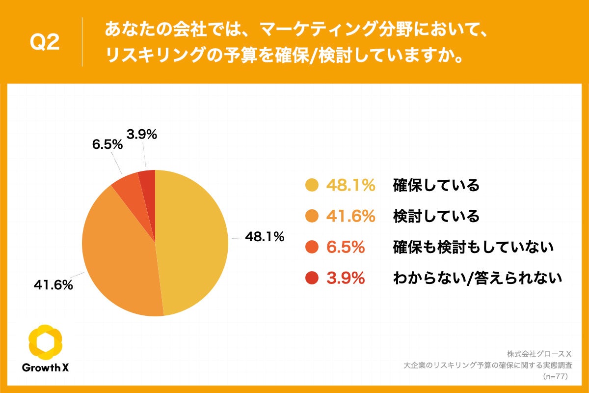 Q1で 「確保している」「検討している」と回答した方に、「Q2.あなたの会社では、マーケティング分野において、リスキリングの予算を確保/検討していますか。」(n=77)と質問したところ、「確保している」が48.1%、「検討している」が41.6% という回答となりました。