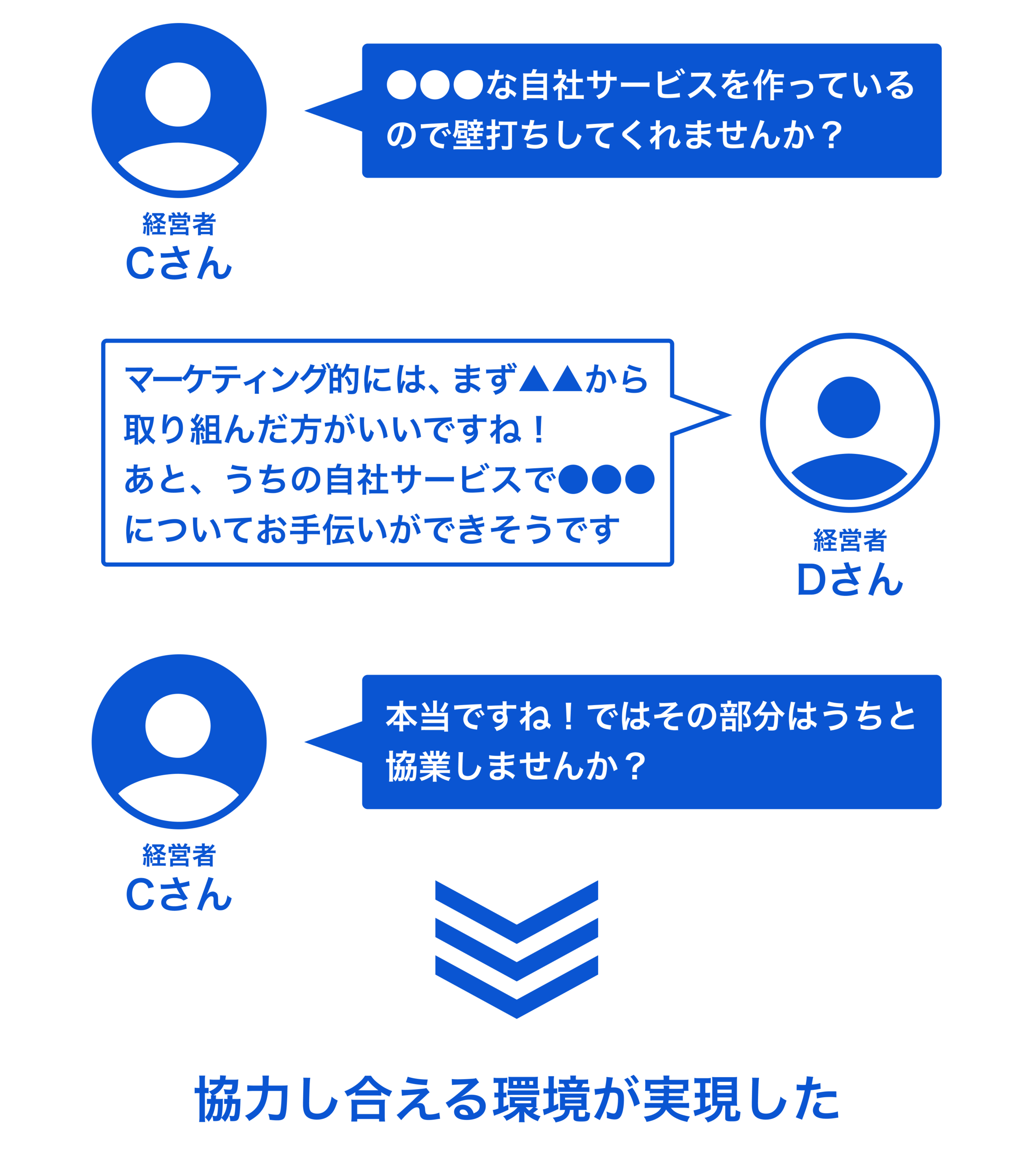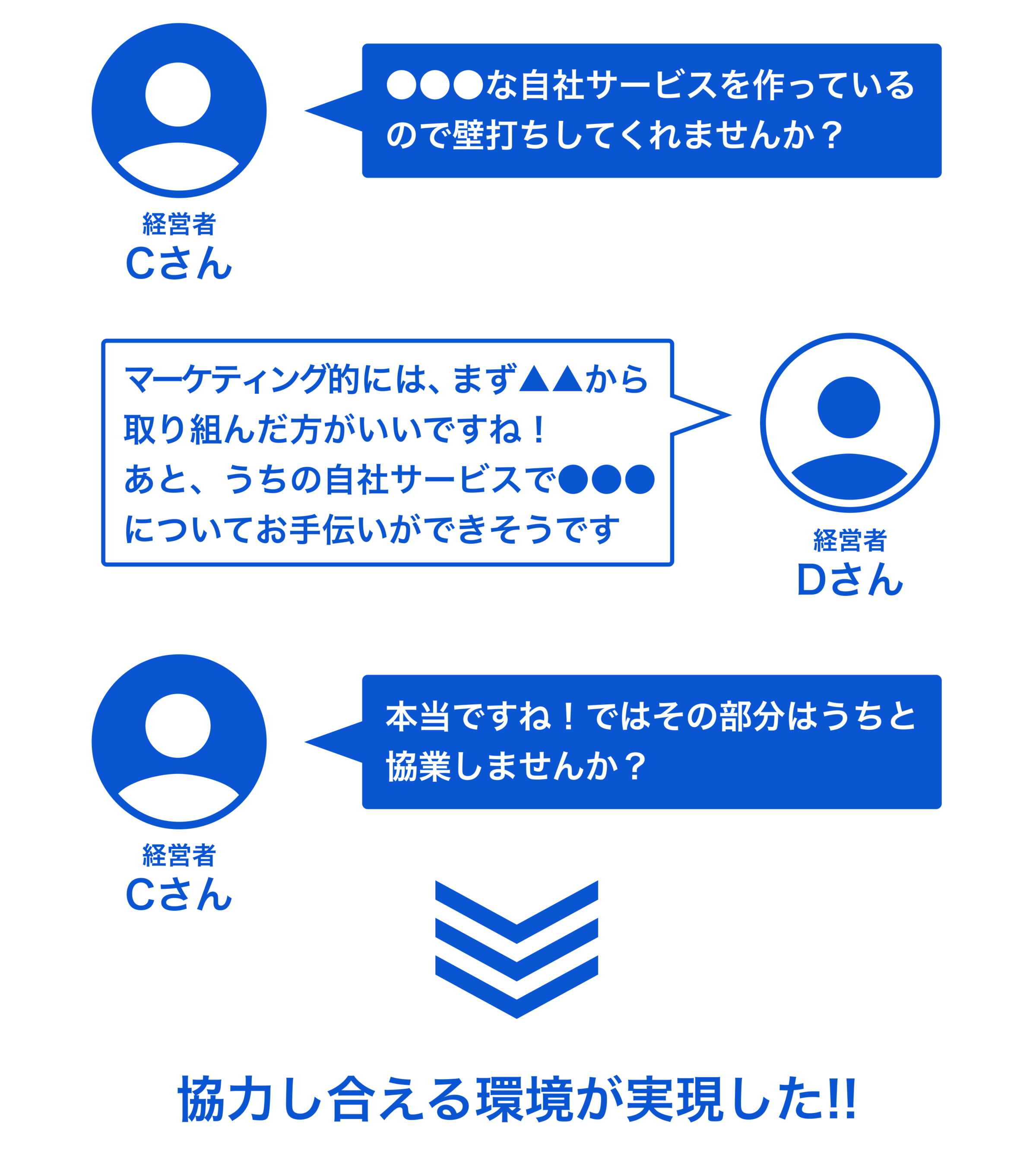 その他にも、自社サービスをもっている加盟企業様には内容をヒアリングしマッチしそうな別の企業様へご紹介したり、自社サービスの悩みを伺い、解決できるナレッジを持っている経営者様とお繋ぎしています。