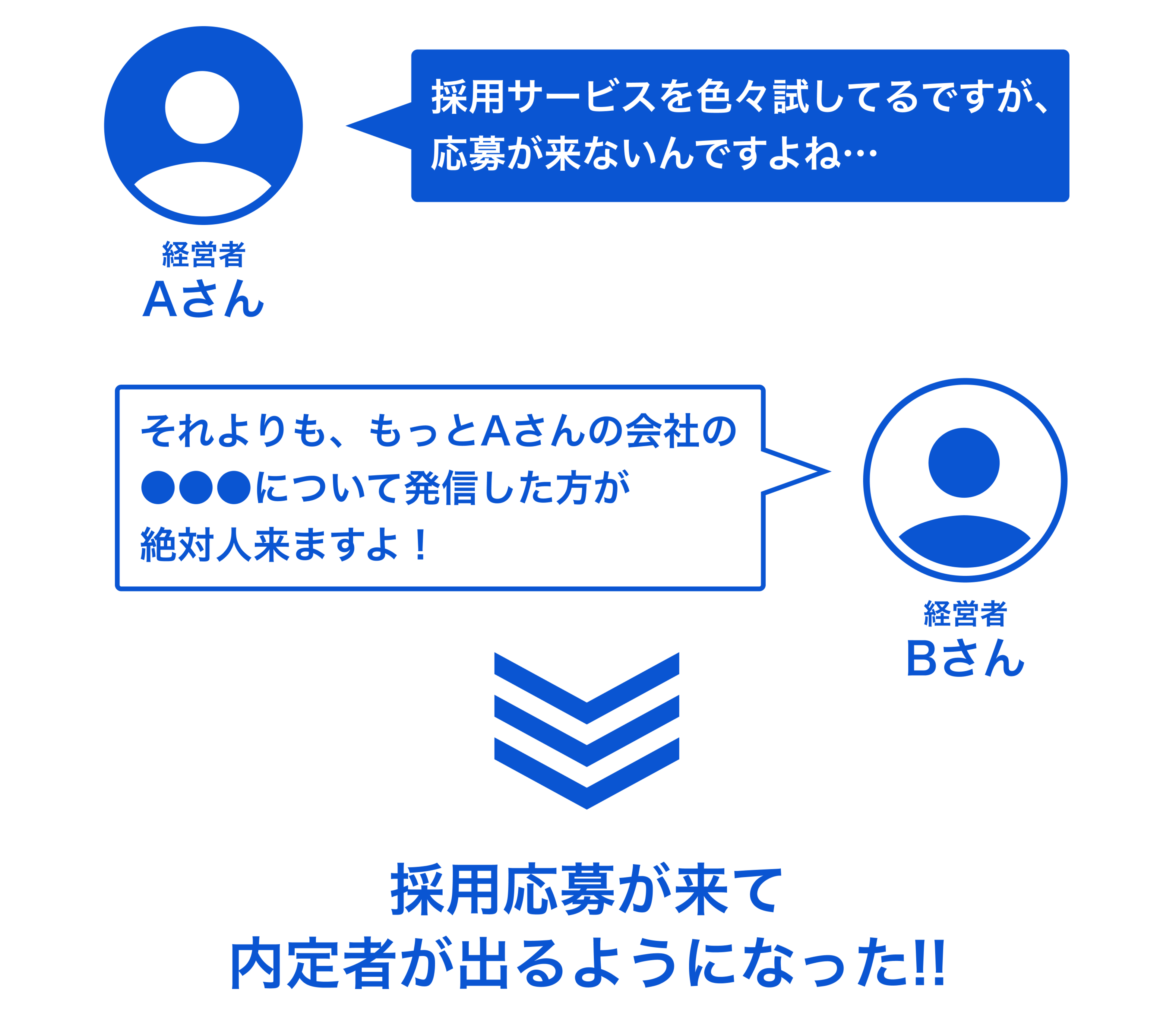 実際に社長懇親会で得たアドバイスから自社にマッチする社員の採用にも繋がり、現在も成功した手法を使い採用戦略の実践・検証に取り組まれている経営者様もおります。