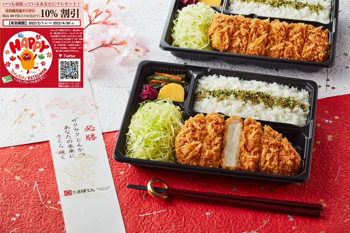 「とんかつ新宿さぼてん」(運営:株式会社グリーンハウスフーズ)では、昨年に続き、頑張る皆さんを応援するデリバリー限定「勝つ帯弁当」を、2月1日(火)から3月15日(火)までの期間限定で販売いたします。 対象はさぼてんの定番、「三元麦豚ロースかつ」と「特撰やわらかヒレかつ」のお弁当2商品。デリバリーを取り扱う全73店舗で販売します。また、対象のデリバリー商品ご購入で、全国のさぼてん店舗で次回ご来店時にご利用できる「10%OFFクーポン」もプレゼントいたします。今年の「勝つ帯弁当」は、サクサクのとんかつを召し上がるお客様の未来が「さくら咲く」明るいものであるよう、必勝の願いを込めたメッセージ付きデザインです。