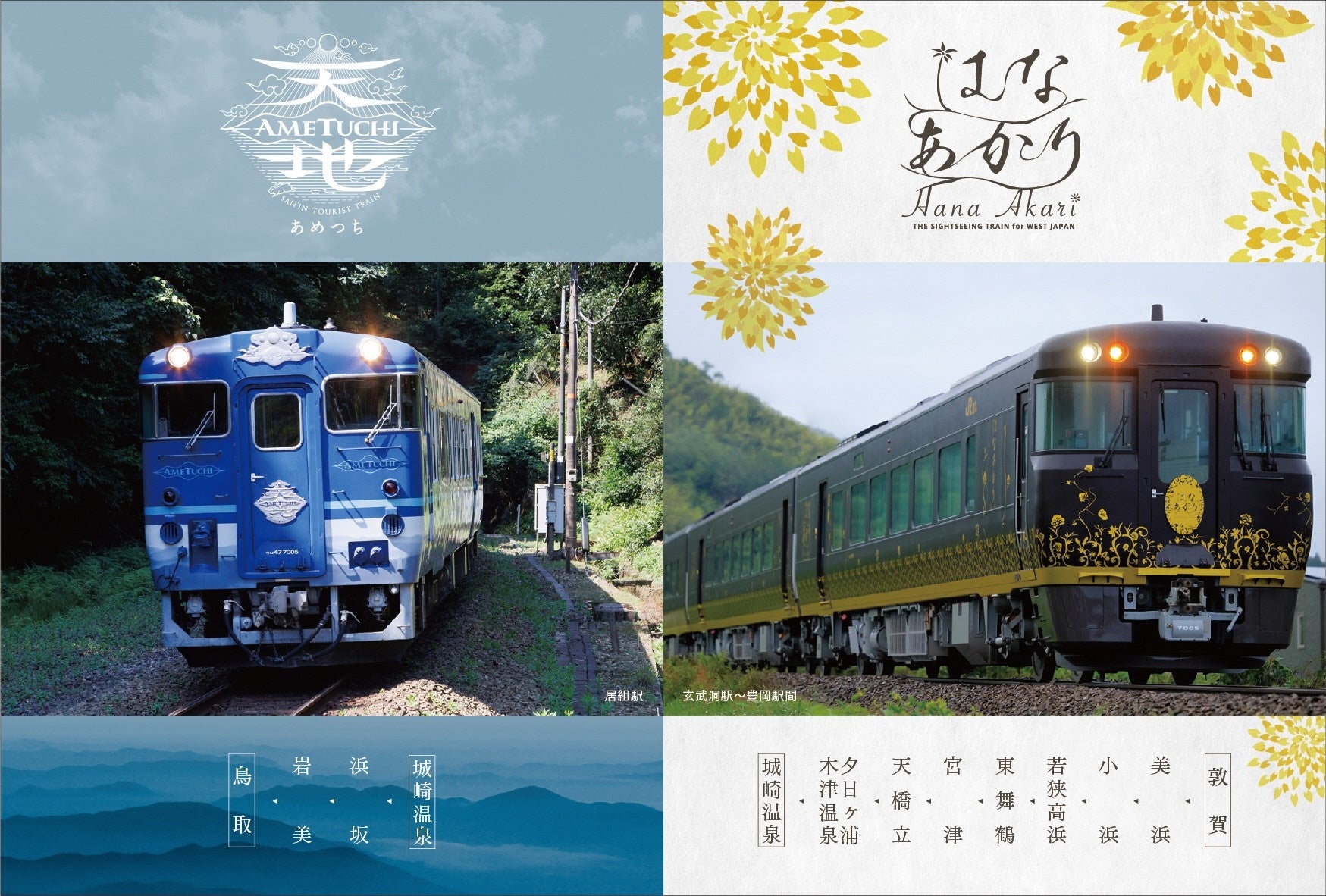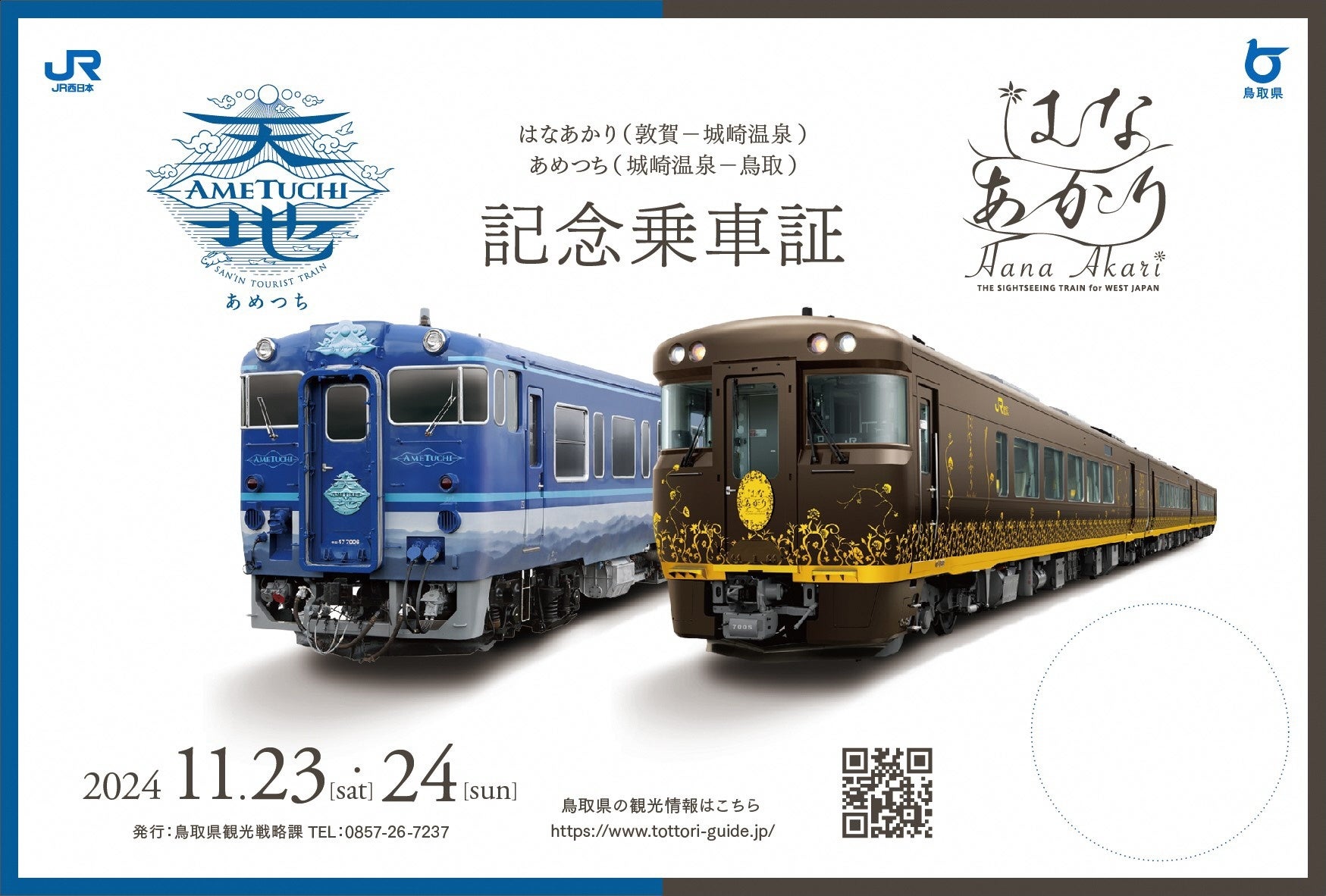 11月23日(土)に観光列車はなあかり(城崎温泉行)、11月24日(日)に観光列車あめつち(鳥取行)を城崎温泉駅で乗り継いだ方に、この日限りの記念乗車証(非売品)を配布します。