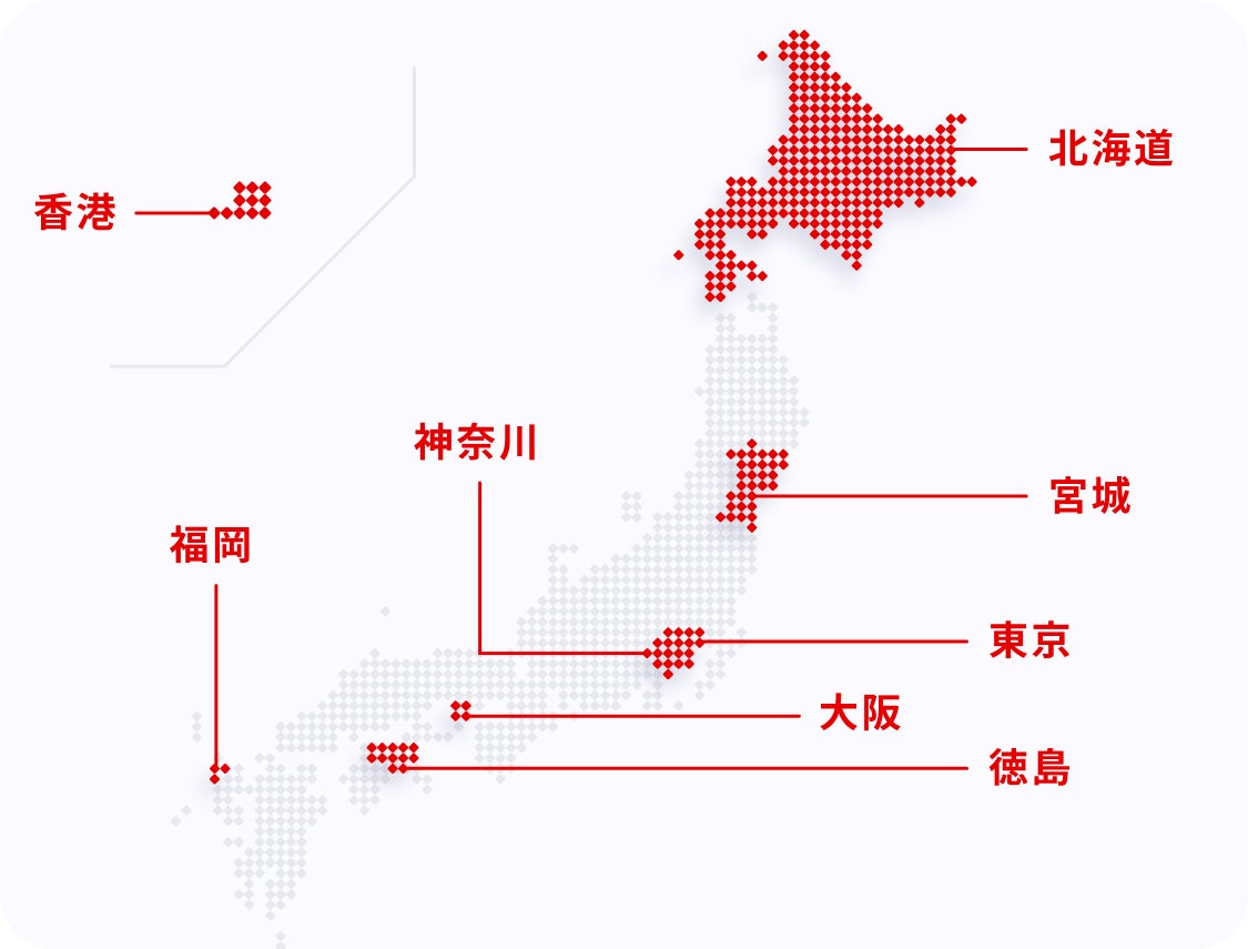 北は北海道、南は沖縄…と思いきや、左上の図は香港です。カウシェは、日本国内だけでなく、海外からの勤務も選択できます。