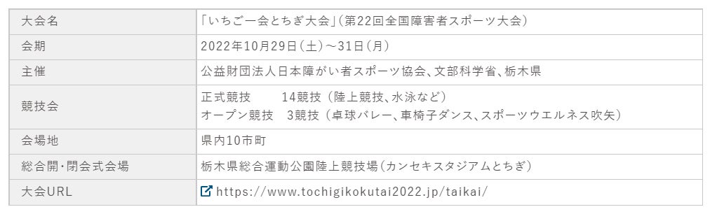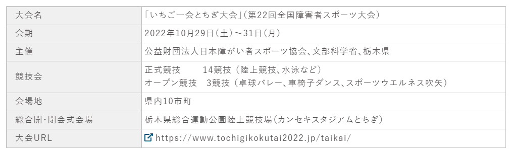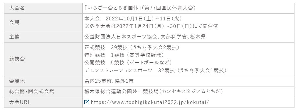 「いちご一会とちぎ国体」(第77回国民体育大会)は、2022年10月1日から11日まで開催される国内最大のスポーツの祭典で、「いちご一会とちぎ大会」(第22回全国障害者スポーツ大会)は、同年10月29日から31日までの会期で開催される国内最大の障がい者スポーツの祭典です。