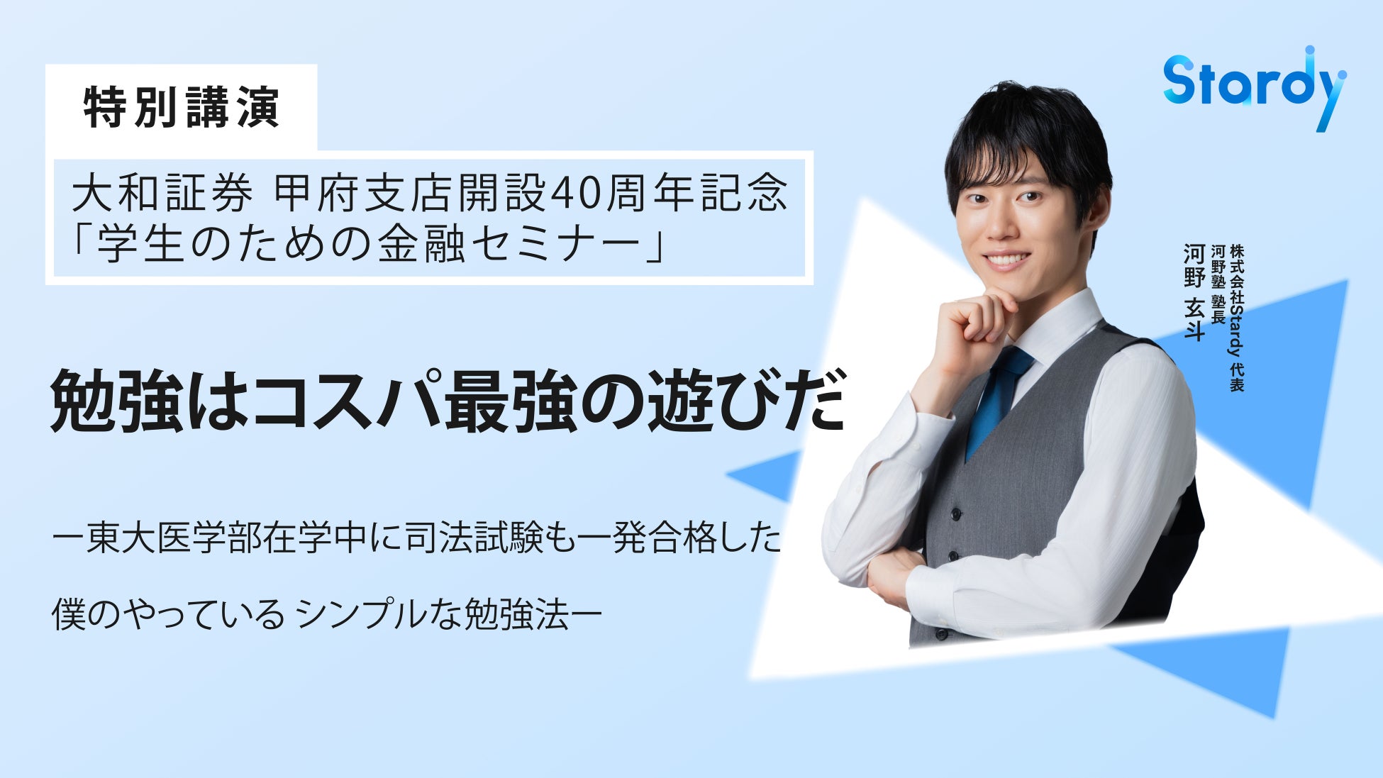 株式会社Stardy代表取締役で河野塾塾長の河野玄斗は、2025年8月8日、山梨県甲府市で開催された大和証券甲府支店主催「学生のための金融セミナー」に登壇しました。