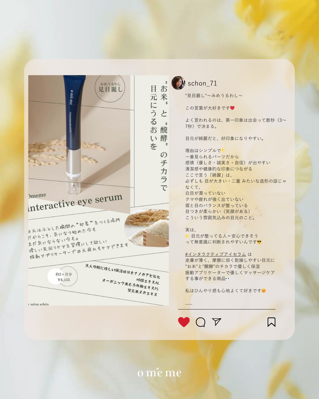and US株式会社(本社:本社:富山県富山市、代表取締役社長:廣岡伸那)が展開するサロン専売コスメブランド「oméme」は、omémeシリーズのリブランディングを行い1周年を迎えました。これを記念し、日頃より「interactive eye serum」をご導入いただいている全国のサロン様を対象としたSNS投稿キャンペーンを開催いたしました。