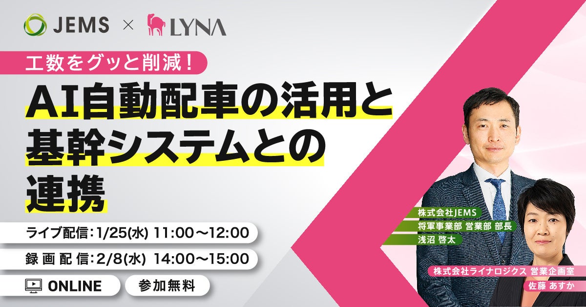「ITで環境問題に挑む」をコーポレートスローガンに掲げる株式会社JEMS(本社:茨城県つくば市、代表取締役:須永裕毅)は、廃棄物処理・資源リサイクル業者様向けに、株式会社ライナロジクス(本社:千葉県市川市、代表取締役:朴成浩)と共同でオンラインセミナーを開催します。ライブ配信 1/25(水)、録画配信 2/8(水)のうち、どちらかご都合のよい日程でご参加ください。