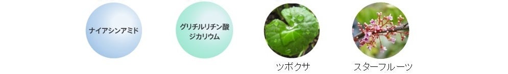 美白&しわ改善有効成分“ナイアシンアミド”を新配合。メラニンの生成を抑え、シミ・ソバカスを防ぎ、しわを改善します。さらに、抗炎症有効成分“グリチルリチン酸ジカリウム”も新配合。ツボクサエキス*2も新たに加わりました。従来より配合されているスターフルーツ葉エキス*2とともにうるおいに満ちた透明感のあるハリ肌に導きます。