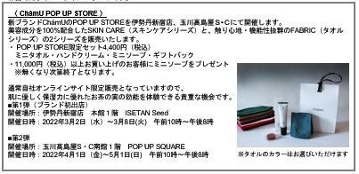 この度、株式会社GSIクレオス(本社:東京都千代田区/代表取締役 社長執行役員:吉永直明)の運営する、ライフスタイルブランド「ChámU(チャミユ)」 が初となるPOP UP STOREを2022年3月2日(水)〜3月8日(火)の期間限定で伊勢丹新宿店にて開催します。