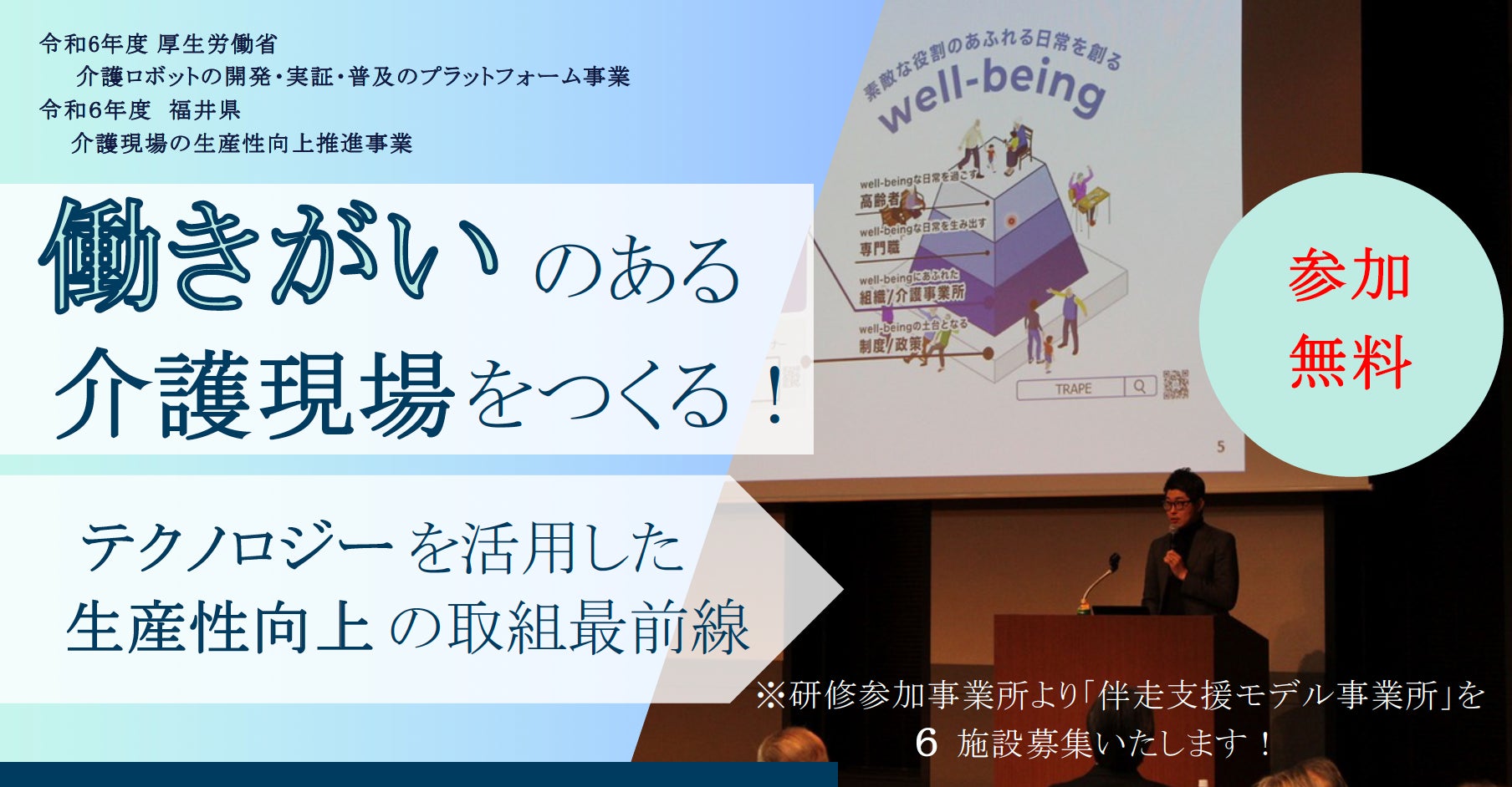 これまで介護現場の生産性向上や働きがい向上、介護ICT導入などに関して豊富な実績を有する株式会社TRAPE(本社:大阪府大阪市、代表取締役社長:鎌田大啓)が、県内の介護事業所のありたい姿を理想のままで終わらせず、本研修会をきっかけとして、県内の介護施設等の介護ロボット等の導入・活用につながるような体験づくりを行っていきます。
