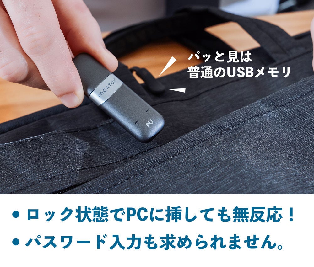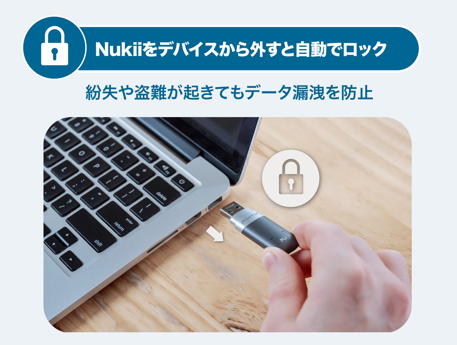 手軽にデータ保存や持ち運びができて便利なUSBメモリですが、置き忘れや紛失による情報漏洩など、セキュリティ上のリスクもあります。Nukii(ニューキー)はオートロックのUSBメモリで、ロック解除にはスマホのNFCを使用します。スマホアプリでユーザーや使用状況を管理、遠隔でのデータ削除、読取専用モードの設定が可能です。万が一置き忘れや紛失が起こっても、常時ロックされた状態であること、また遠隔でデータを削除できるので、情報漏洩の心配はありません。そんな最新のセキュリティ機能ですが使い方はとても簡単、パソコンを使った面倒な登録や設定は不要、シンプルな操作でより安全にデータを保存することができます。