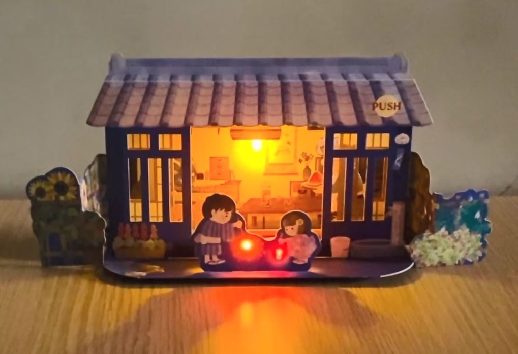 LEDライトの光と音による豊かな表現が魅力のサマーオルゴールカードは、どこかで体験したような懐かしい気持ちにさせてくれる日本家屋の風景。庭先で花火を楽しむ浴衣姿の子どもたちや、優しい表情で孫を見守るおばあちゃんが描かれています。「茶摘み」のメロディーに合わせて線香花火の音や虫たちの声が流れます。