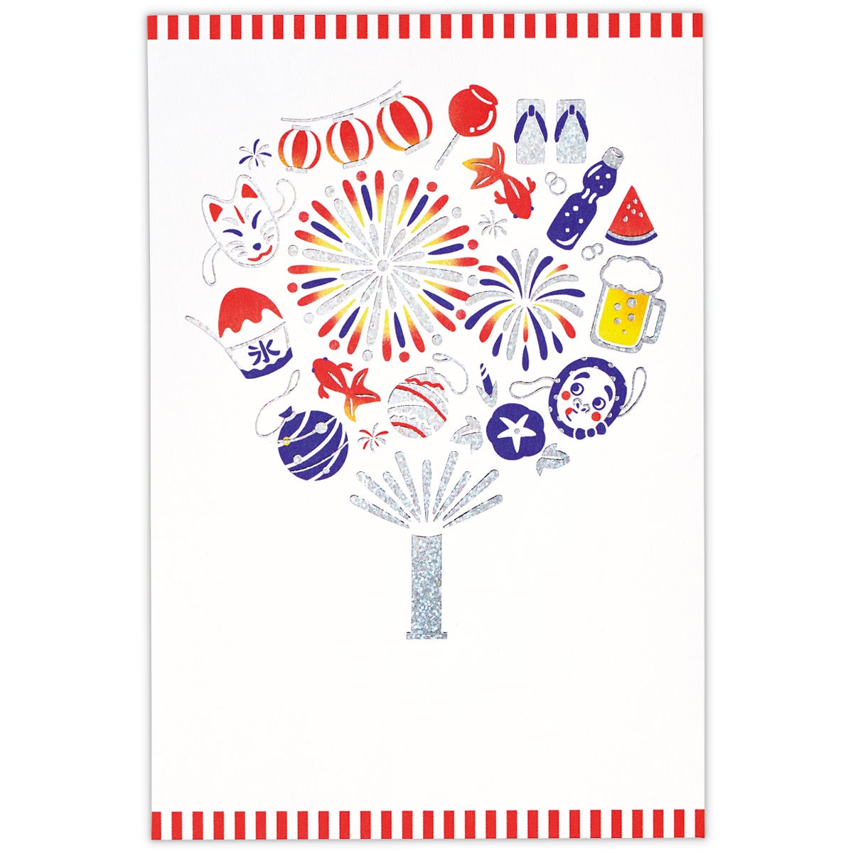人気が高まっている花火やひまわりモチーフを拡充。花火のカードは透明素材とホログラム箔を組み合わせてきらめく夜空を表現。透明素材に描かれたビル群や花火の重なり、ちらちらと光るホログラム箔が新鮮な印象です。