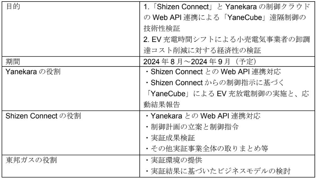 本実証では、Shizen Connect が開発・運用するアグリゲート・エネルギー管理システム「Shizen Connect」(以下、「Shizen Connect」)を活用し、Yanekara が提供する EV 充電コントローラー「YaneCube」の制御クラウドとの Web API 連携を通じて、「YaneCube」経由で EV 充電の遠隔制御を行います。JEPX 価格の高い時間帯の EV 充電を停止させ、より価格の安い時間帯での EV 充電へとシフトさせることで、小売電気事業者である東邦ガスの卸調達コストの削減を目的としています。
