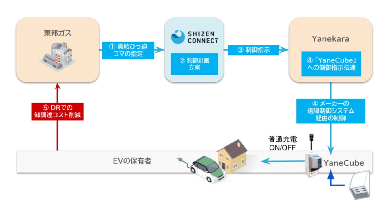株式会社 Yanekara(以下、Yanekara)、株式会社 Shizen Connect(以下、Shizen Connect)は、VPP(*1)により需給ひっ迫対策及び小売電気事業者の電力調達コスト削減を実現する「機器制御型 DR 支援サービス」(*2)のプラットフォームの更なる拡大を目指し、EV(電気自動車)充電の遠隔制御の技術性及び経済性を検証する共同実証(以下、本実証)を、東邦ガス株式会社(以下、東邦ガス)を含めた 3 社で、2024 年 8 月より開始します。