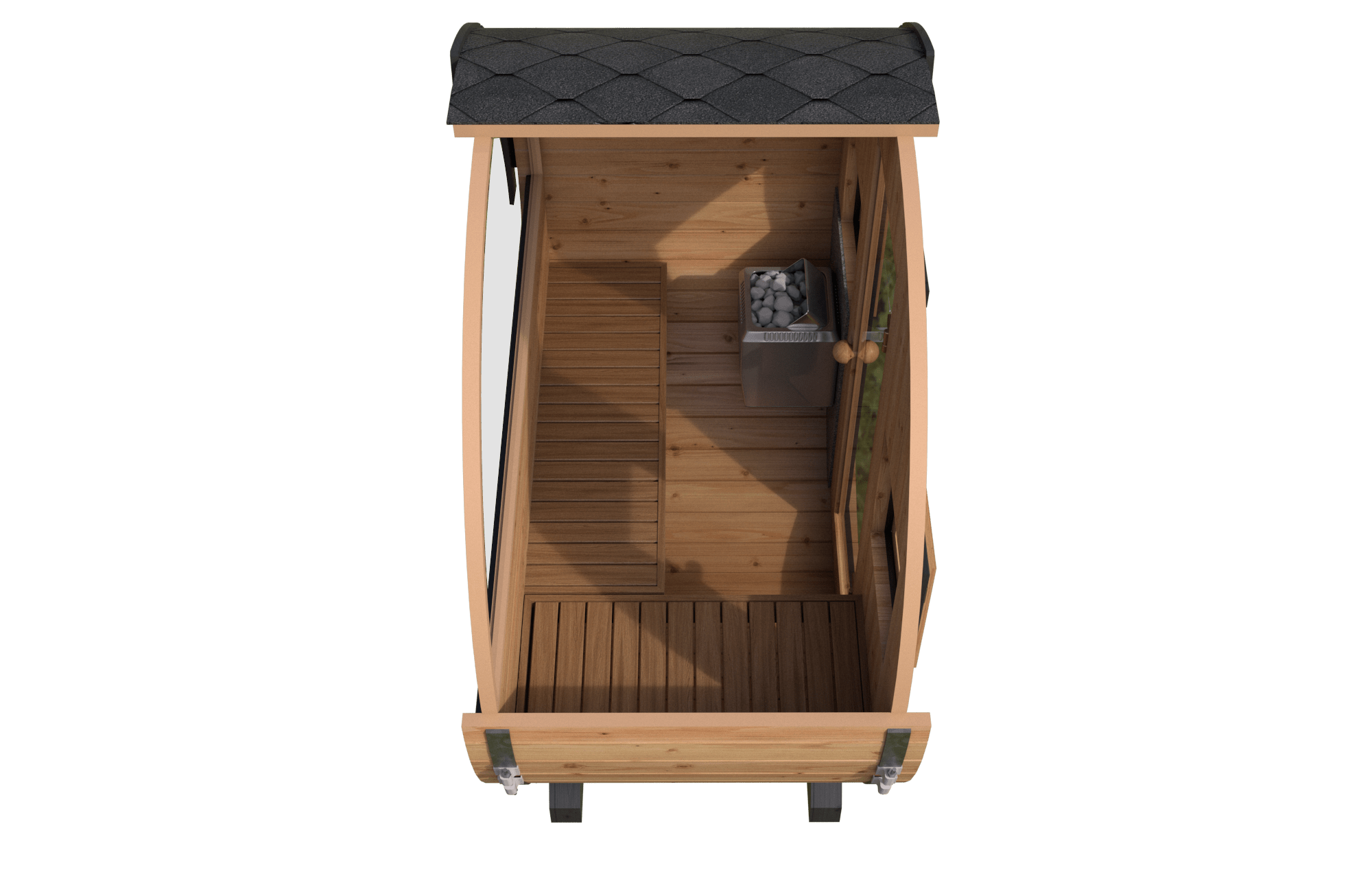 今回のモデルチェンジはそういったエストニアの「サウナ観」を踏襲し、2.2mの事業用仕様(プロフェッショナルモデル)では、日本でも珍しい「前面フルガラス」オプションを新たに提供。前面側でも眺望を楽しめることが可能になりました。