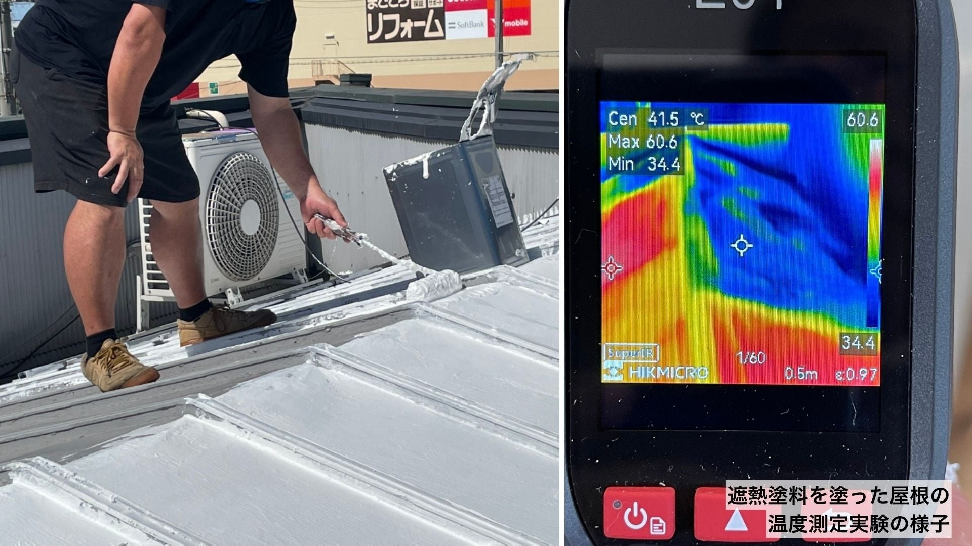 塗料による温度抑制:当社の遮熱断熱塗料を塗布することで太陽熱を91%以上反射し、屋根裏温度を14℃以上抑制します。自社実験では、一般的な屋根用塗料と比較して圧倒的な遮熱性能を示しました。