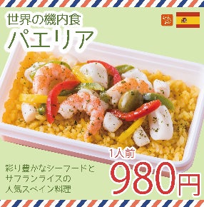 言わずと知られた世界的に人気のスペイン料理の一つで、機内食風にアレンジした彩り豊かなシーフードパエリアをお楽しみください。