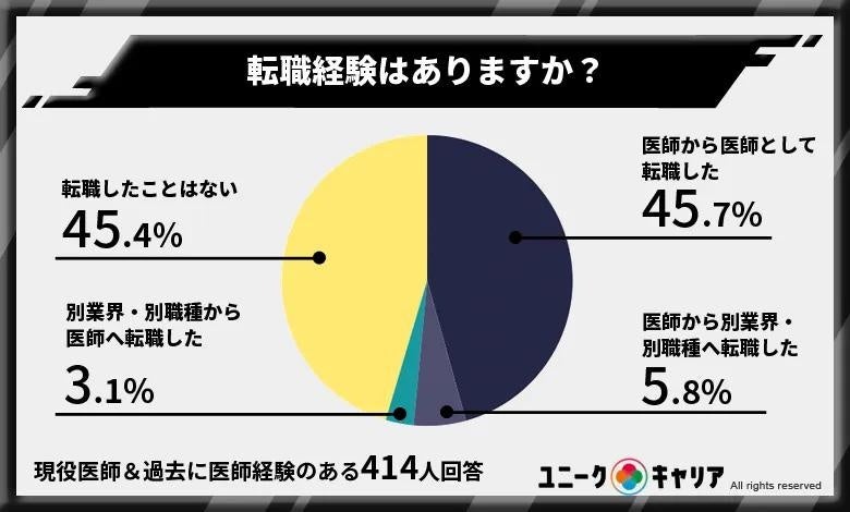 現役医師や過去に医師経験がある414人の内、転職経験がどれくらいの割合なのか調査を行った。