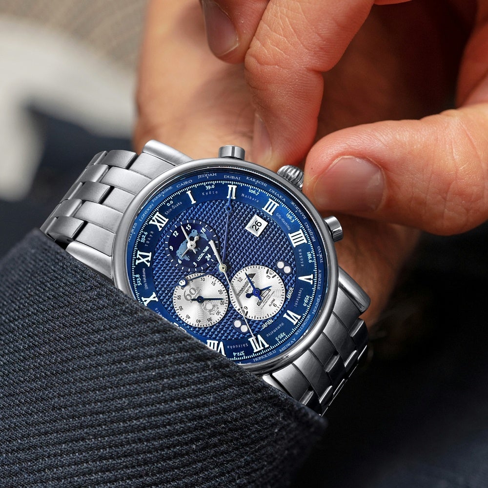 GMT針を操作して都市名を選ぶことで、サブダイヤルにその都市の時刻を表示。ロンドン、パリ、ニューヨーク、東京など、世界各地の時間を瞬時に確認できます。